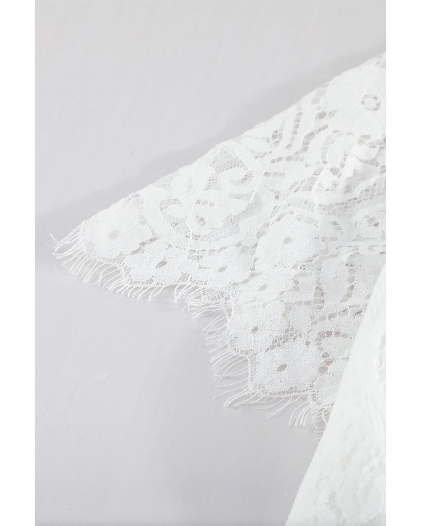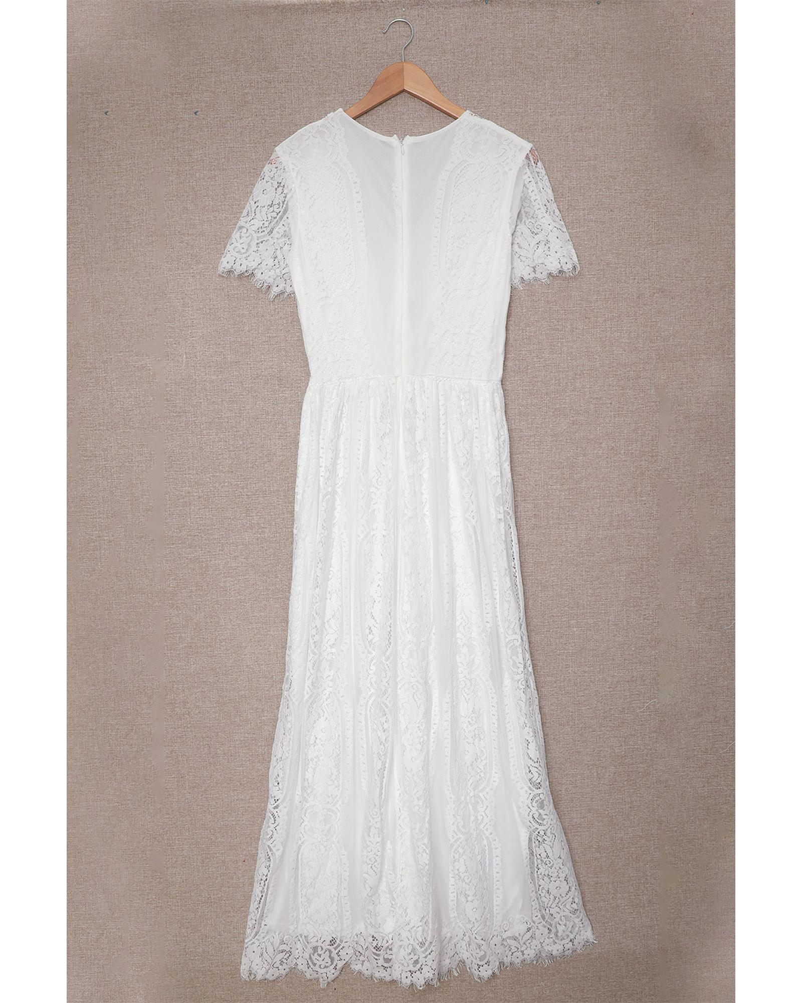 This lace maxi dress features a delicate lace overlay with a tulle underlay, accented by soft eyelash lace trims. It has a V-neckline, short sleeves, and a full bodied skirt that creates an elegant silhouette. The design includes a sheer crochet waistband with soft scalloping details and is fully lined for comfort. A concealed back zipper ensures a smooth fit, and the dress offers low elasticity for a comfortable wear.