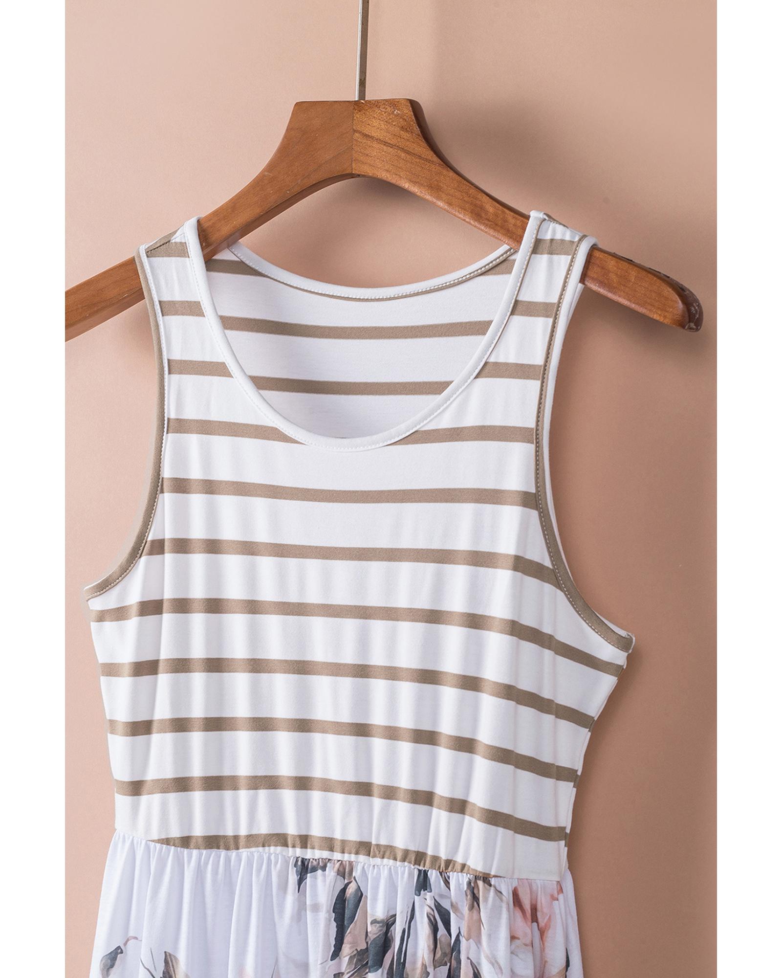 This sleeveless maxi dress features a stylish combination of striped and floral prints, creating a fashionable and eye-catching look. Designed to highlight the neck and shoulder lines, it offers a comfortable fit with added functionality through a convenient pocket. Made from soft, high-quality fabric, it is suitable for various occasions and easy to pair with accessories for a chic appearance.