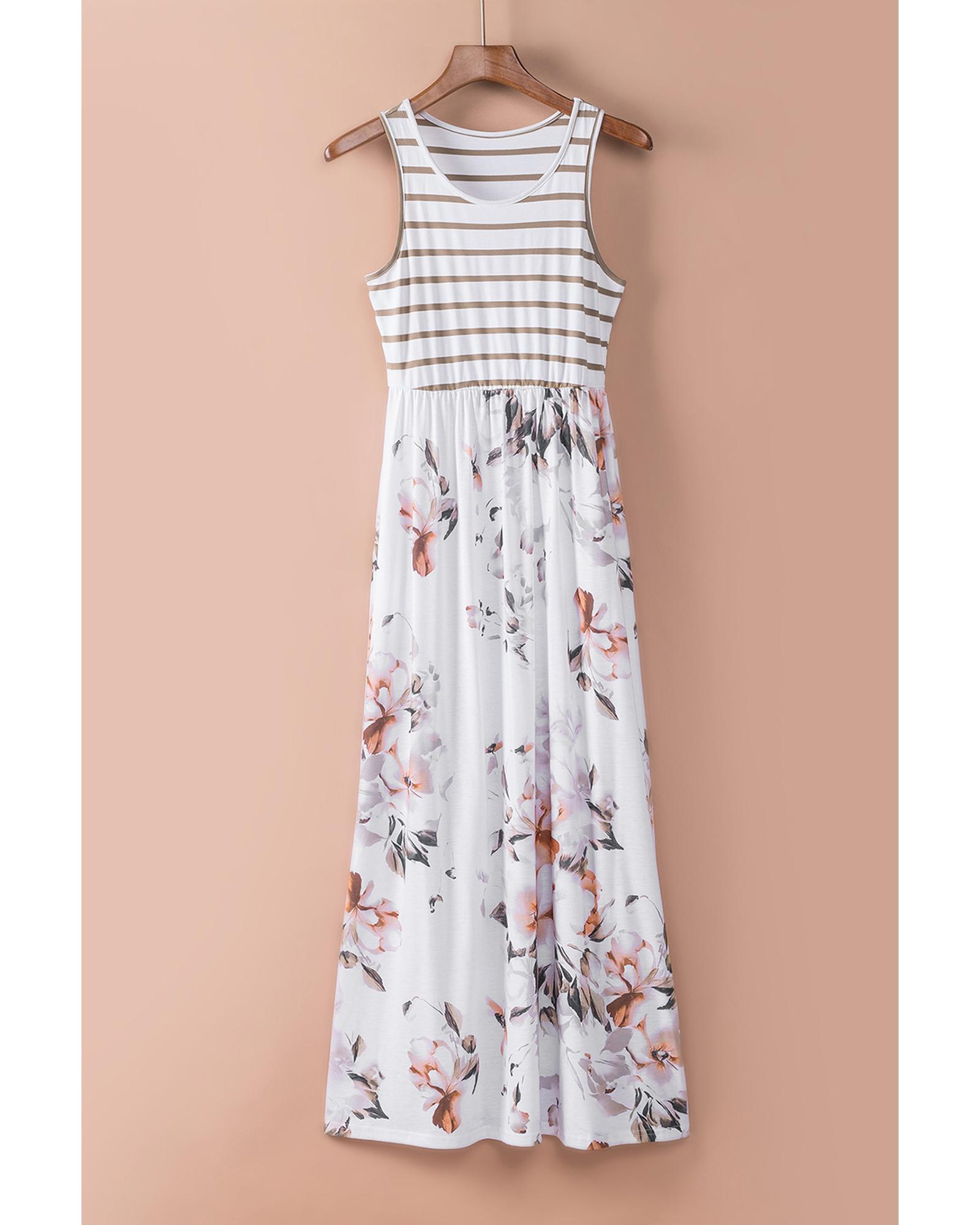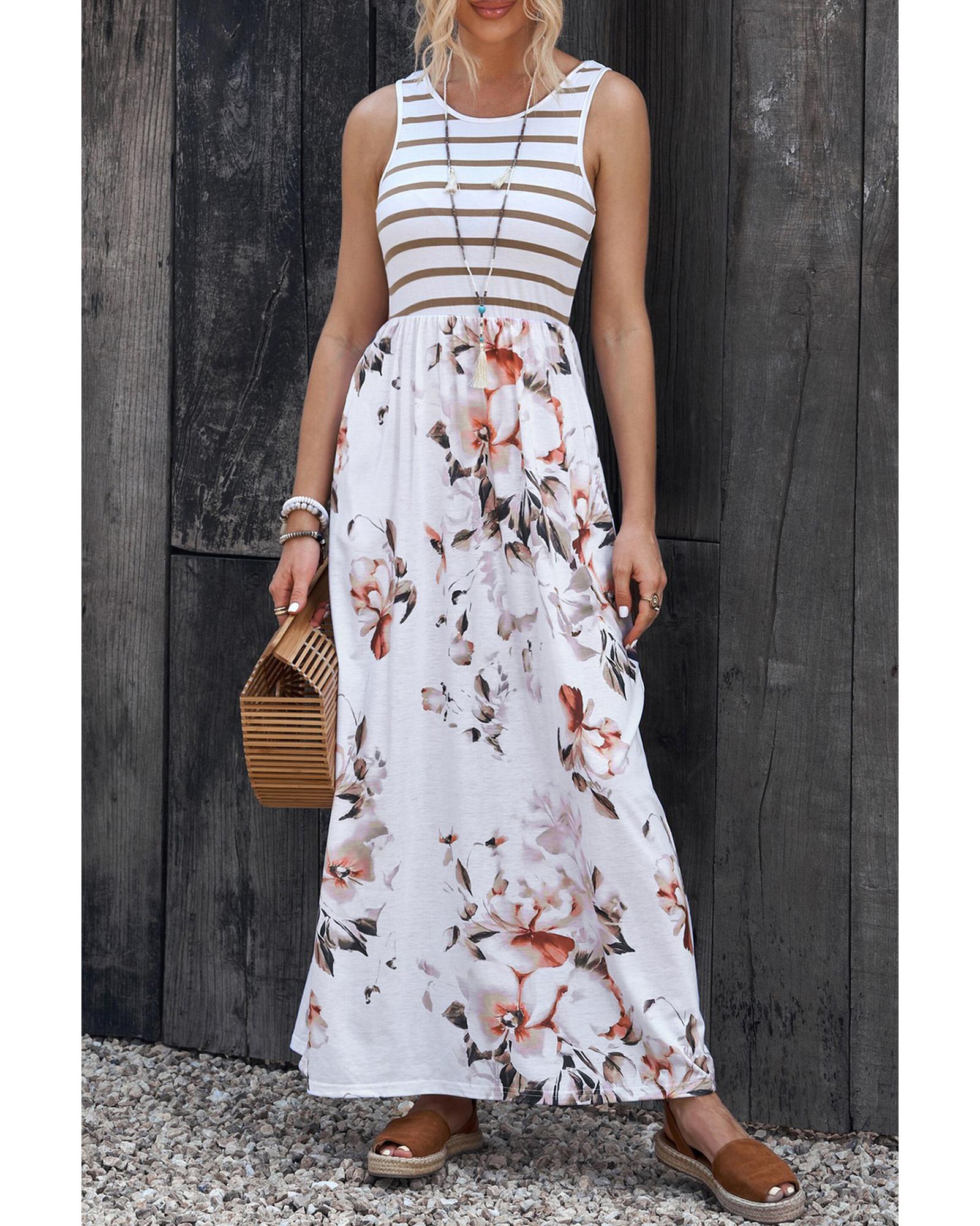 Azura Exchange White Striped Floral Print Sleeveless Maxi Dress with Pocket – L