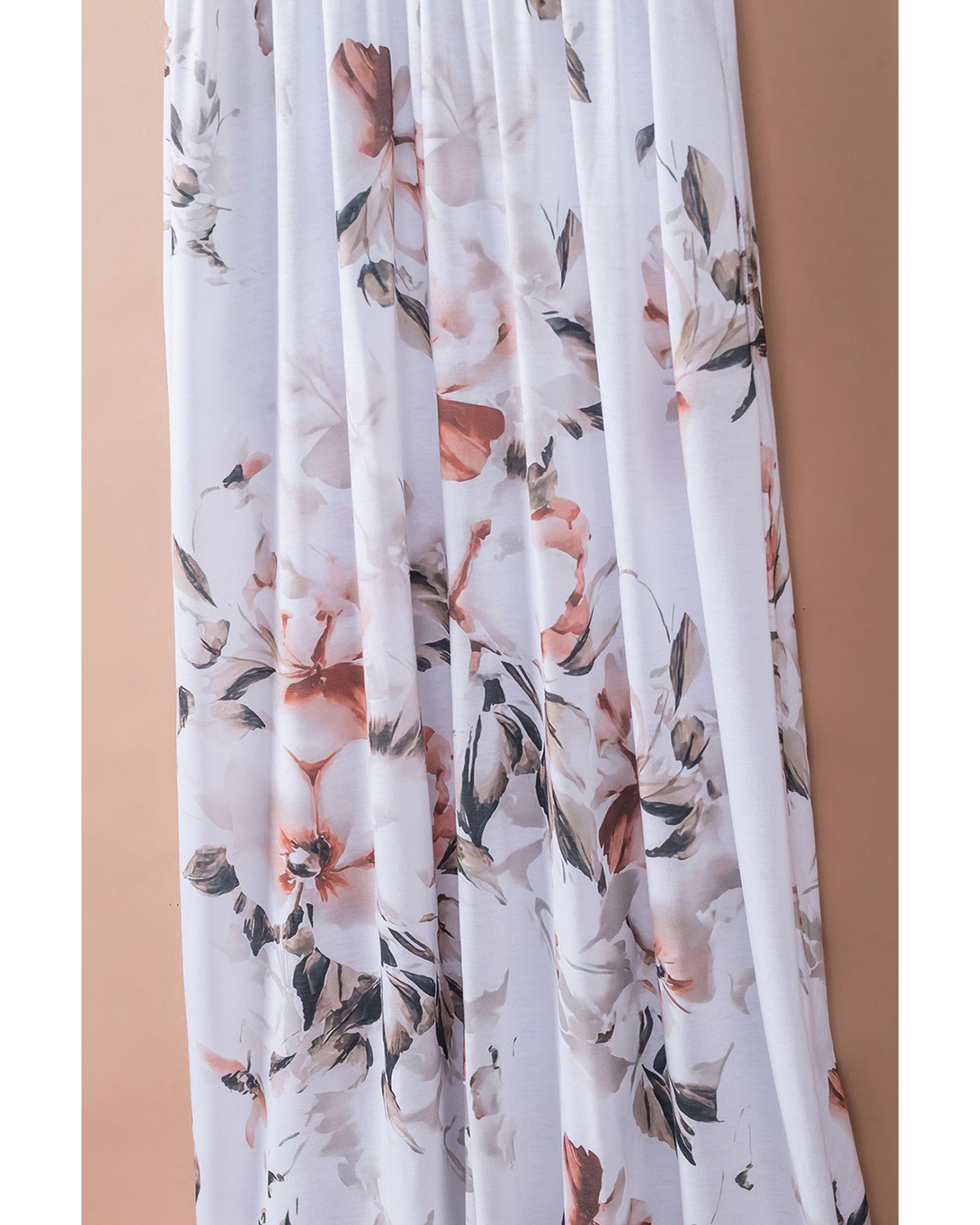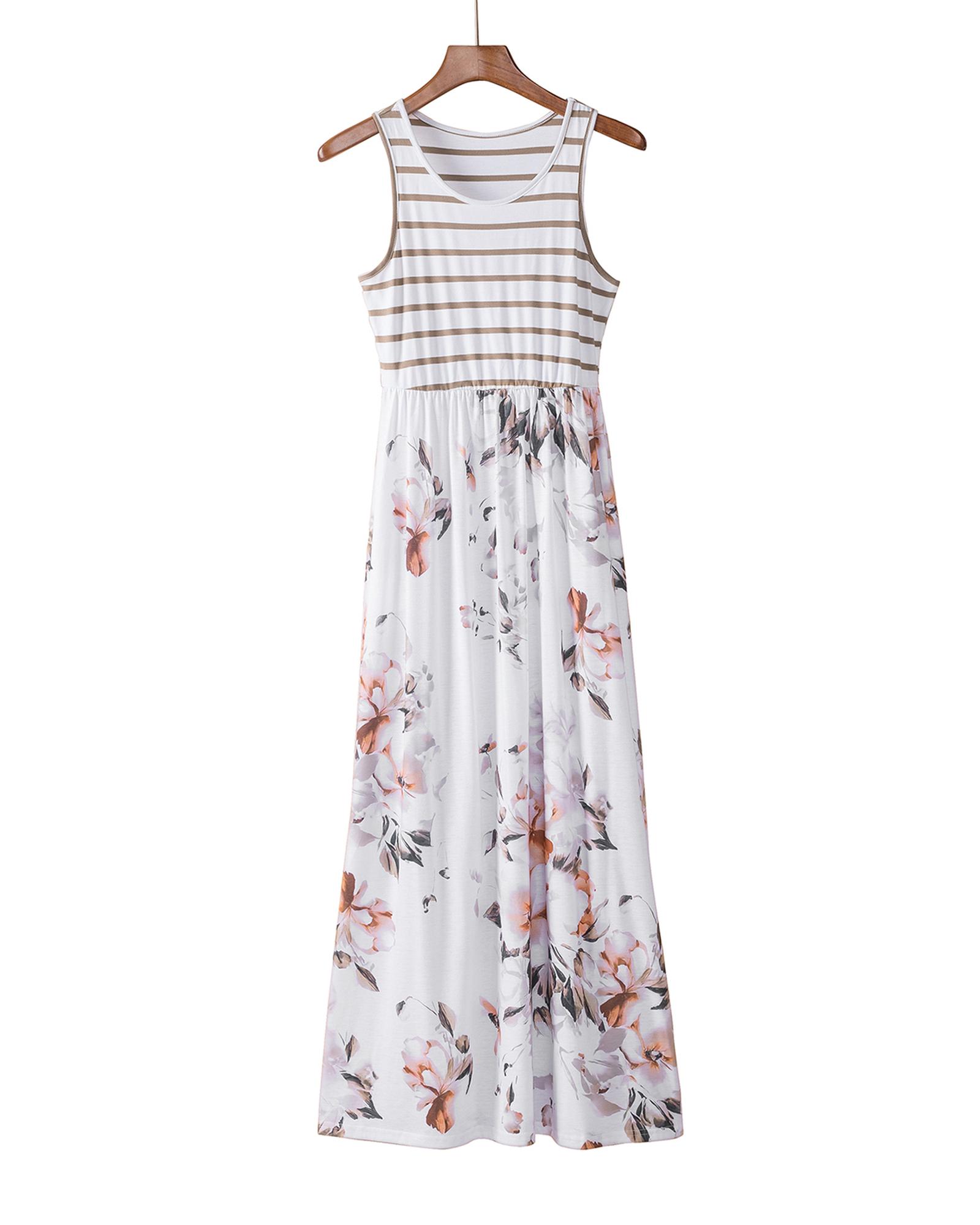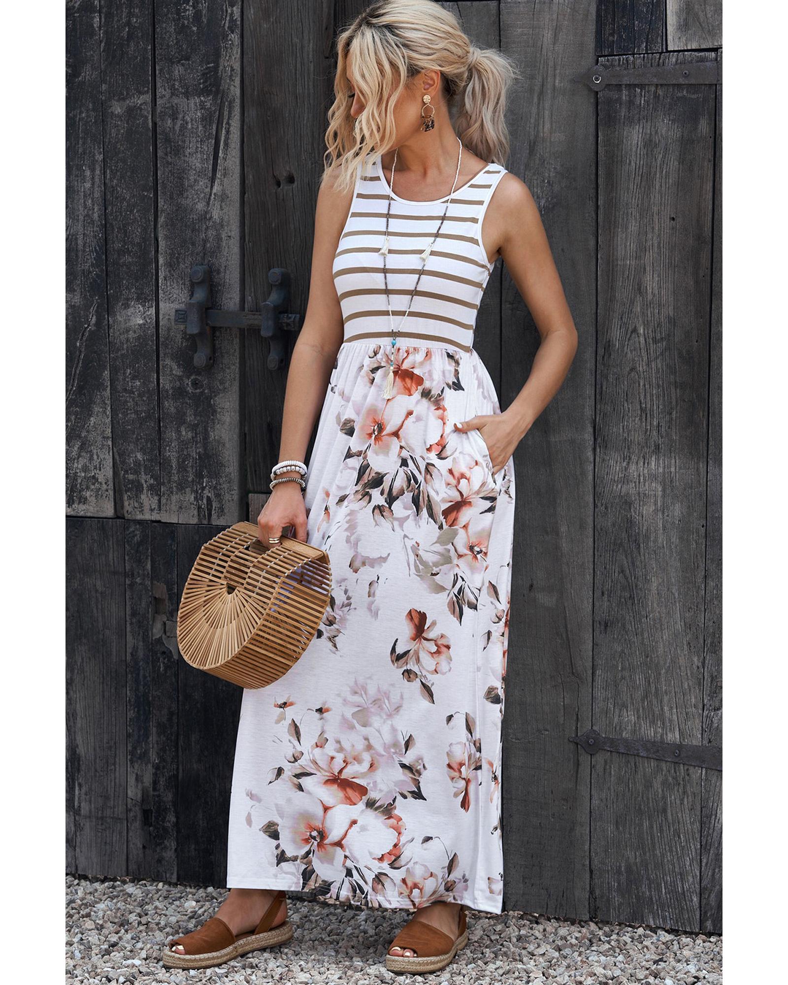 This sleeveless maxi dress features a stylish white striped floral print, combining striped and floral patterns for a fashionable appearance. The design highlights the neck and shoulder lines, creating a flattering silhouette. It also includes a pocket for added practicality, making it both functional and chic. Crafted from soft, high-quality fabric, this dress offers comfort and a smooth feel, perfect for various occasions.