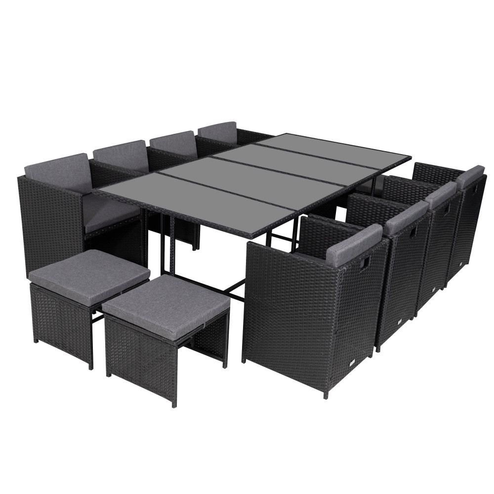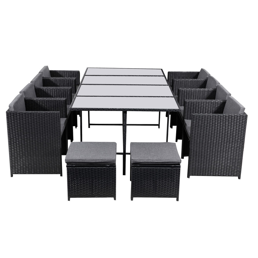 This outdoor dining set features a modern and stylish rattan design, making it a perfect addition to your patio or garden. It includes 13 pieces, suitable for entertaining and outdoor family meals. The set combines durability with a sleek appearance, providing a practical and luxurious outdoor furniture solution for year-round use.
