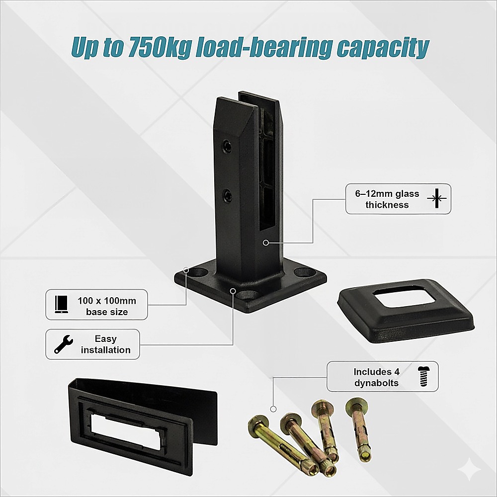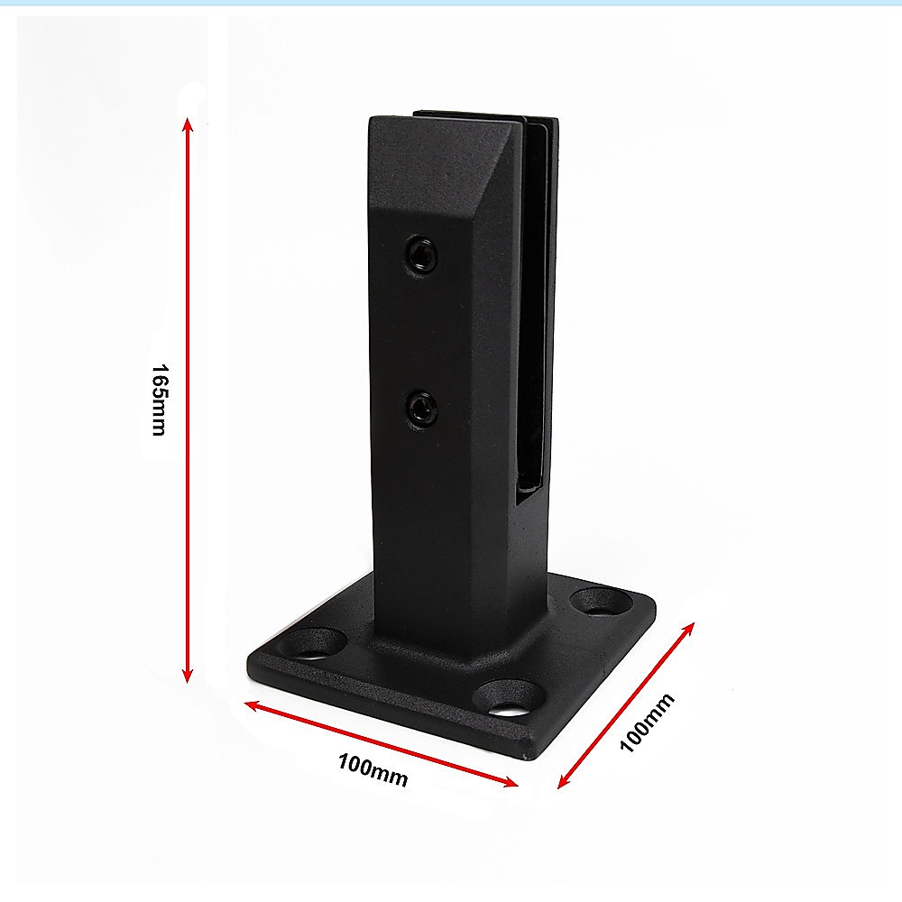 This product is a black glass clamp made of 304 stainless steel, designed for securing glass panels in various fencing applications. It combines durability with a modern aesthetic, making it suitable for pools, gardens, balconies, and staircases. The clamp is easy to install and provides a strong hold for glass panels, enhancing both safety and visual appeal.