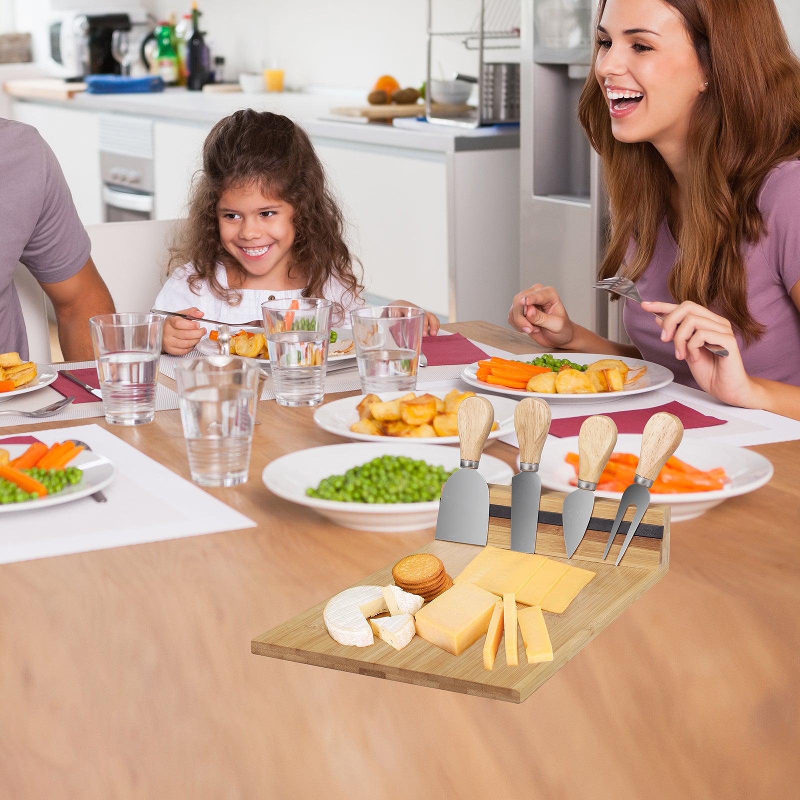 This bamboo cheese board and knife set is a stylish and functional addition to any dinner party or gathering. It features a spacious wooden surface for serving a variety of cheeses, dried fruits, cold meats, and other appetizers. The set includes four stainless steel cheese knives stored securely on an integrated magnetic strip, ensuring easy access and preventing flavor cross-contamination.