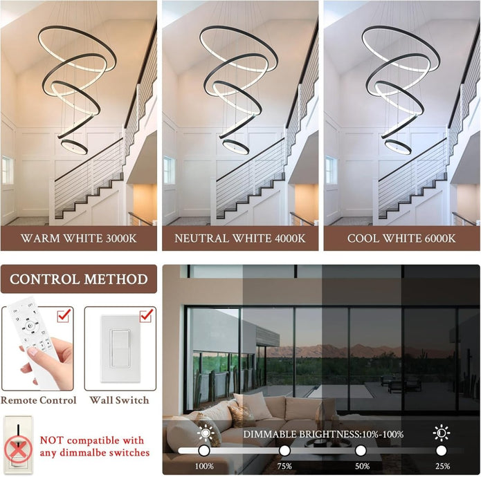 This modern LED chandelier features a sleek design with adjustable rings, making it suitable for various interior spaces. It offers customizable shapes and sizes, creating a warm and elegant atmosphere. The chandelier is equipped with energy-efficient LED lighting and remote control for convenient operation.