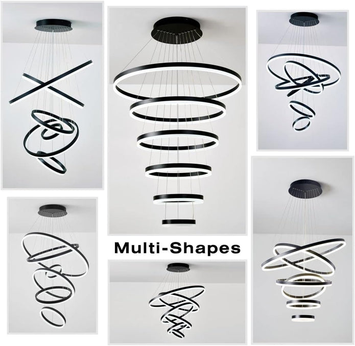 - Modern 6-Ring LED Chandelier with a sleek circular frame, offering a contemporary look and high durability.