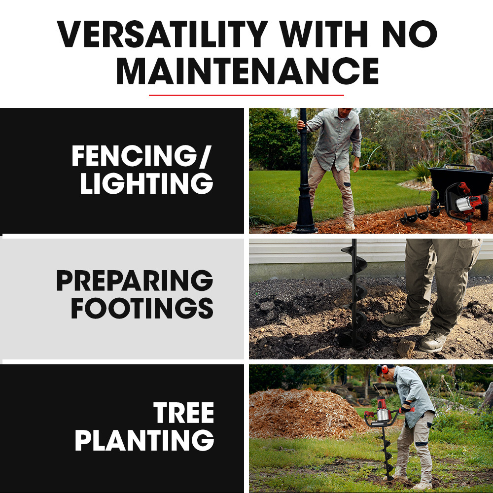 Features include anti-vibration ergonomic handles for comfort and safety, a rugged steel chassis, and a copper induction motor with air cooling to ensure long-lasting performance. The tool is compatible with different auger bits, allowing versatility for different soil types and project requirements. A power safety lock enhances operational safety by preventing accidental startup.