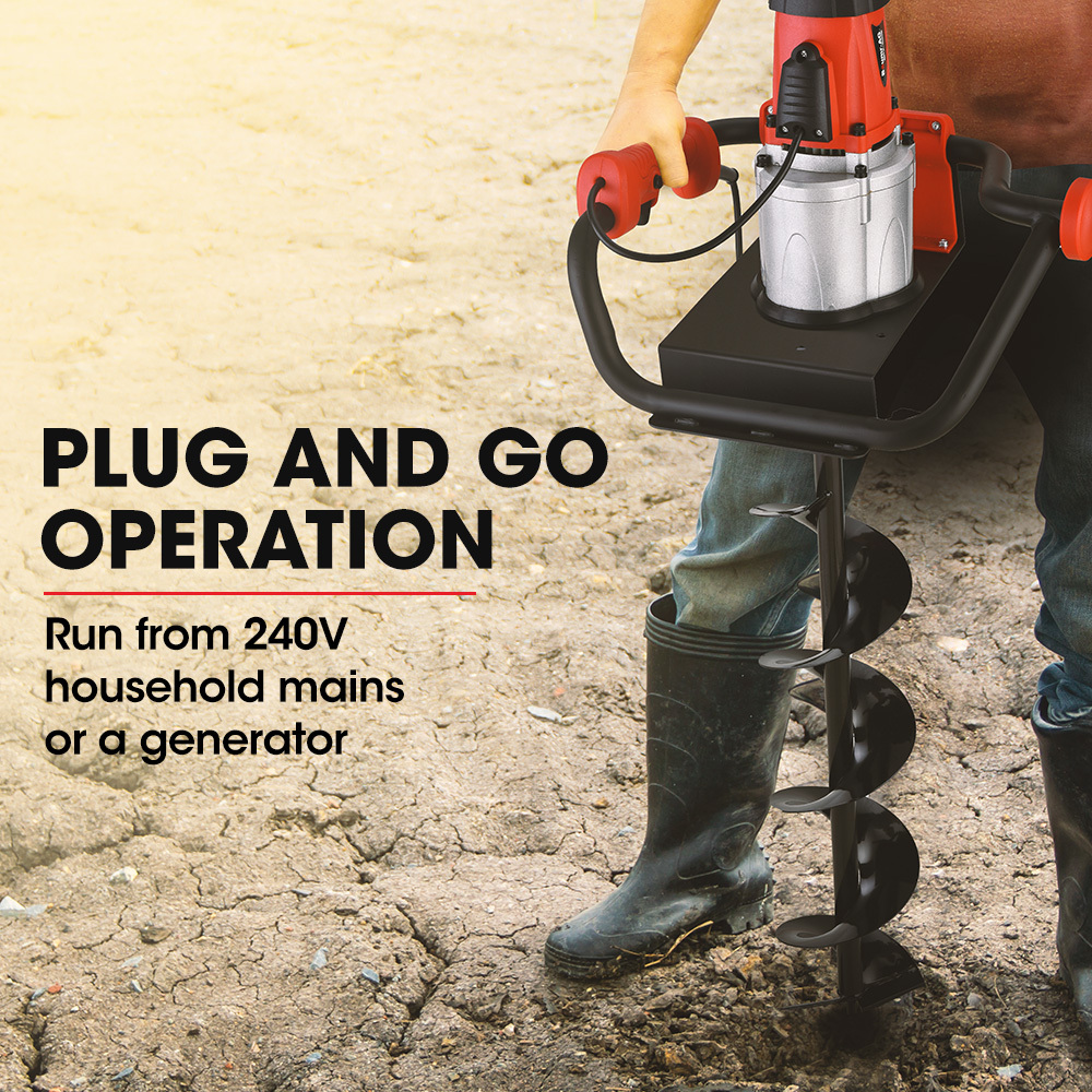 The electric post hole digger features a powerful 1500W motor, capable of delivering reliable performance for various digging tasks. Its durable construction and ergonomic design make it suitable for use at home or on the jobsite, providing efficient and easy operation.