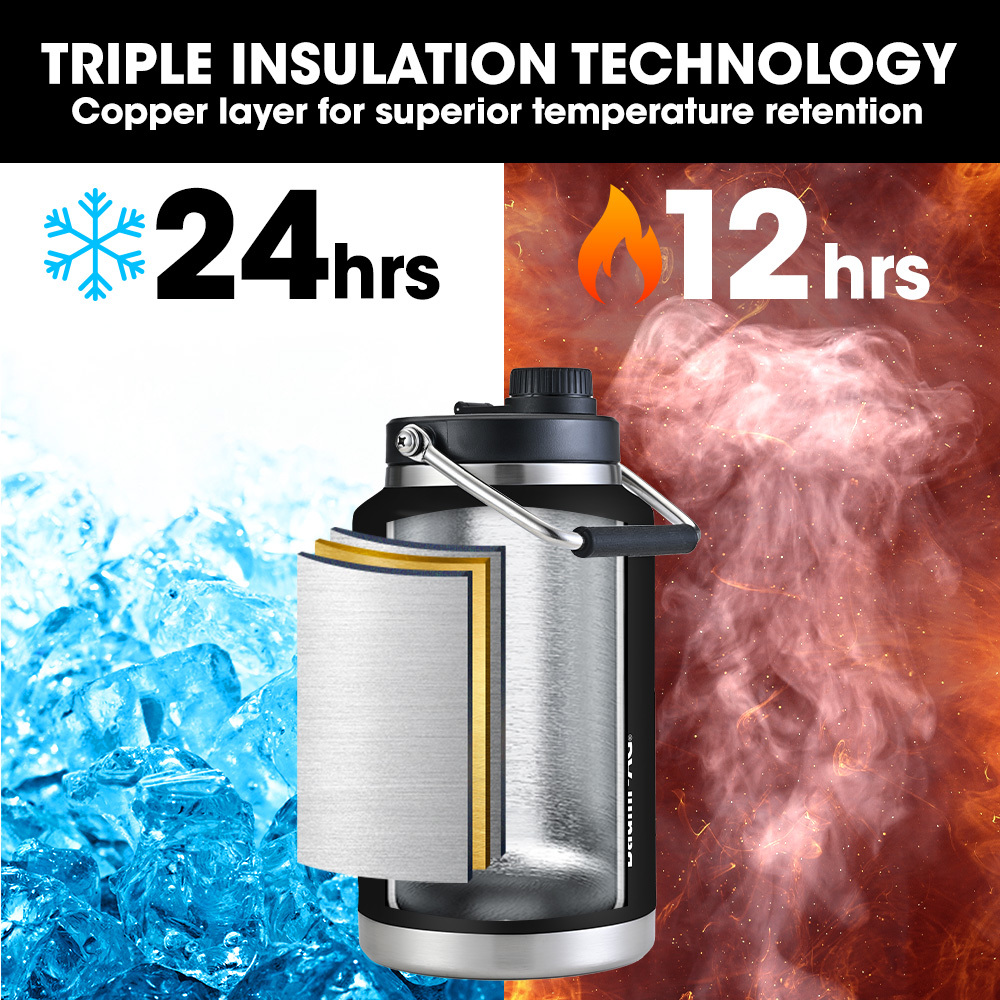 This double-wall insulated stainless steel water bottle is designed for durability and performance. It features triple insulation technology to keep beverages cold for up to 24 hours or hot for 12 hours, making it suitable for various outdoor and work environments. The rugged exterior and secure handle provide convenience and reliability, while the large capacity ensures ample hydration throughout the day.