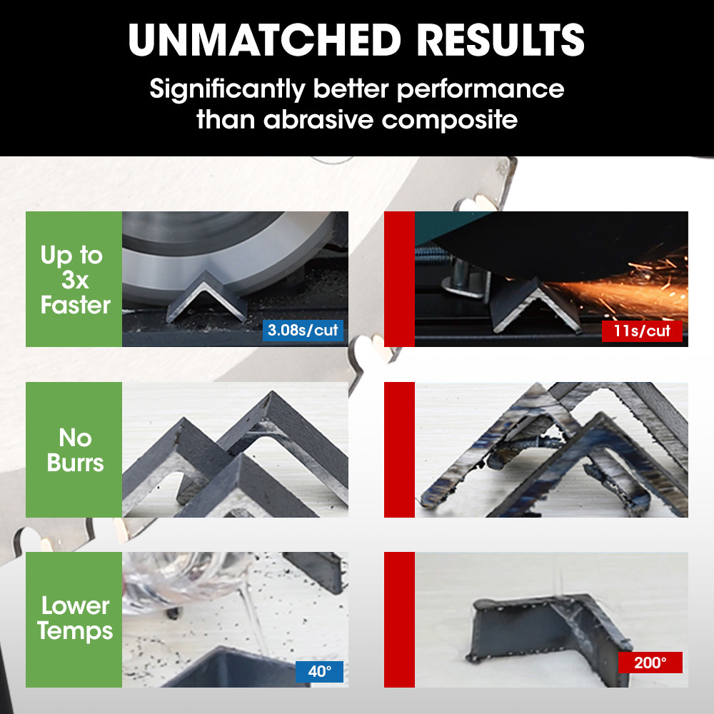 This premium ceramic alloy tooth saw blade is designed for cutting ferrous metals and steel with low rpm cut off saws. It offers a longer lifespan, smoother cutting performance, and produces virtually no sparks during operation.