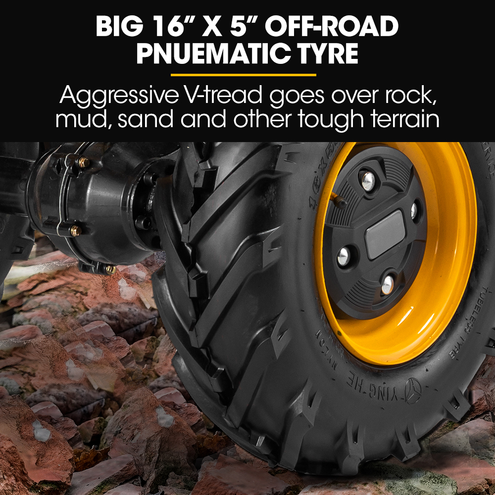 - Large front tyres (16 x 5 inches) with deep V-tread for superior traction