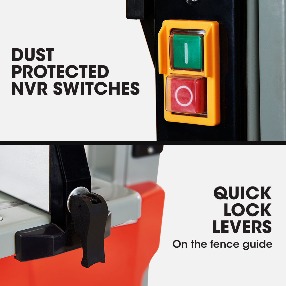 Features include a tool-less adjustable table that tilts from 0 to 45 degrees for bevel cuts, a large work table with a precise scale, a quick-lock clamp locking fence system, dust protected switches, and a dust port for connection to a dust extractor. The saw also comes with a push stick for safe operation and a rapid blade tension system for easy blade alignment. The heavy-duty stand offers stability with reinforced support and additional leg support.