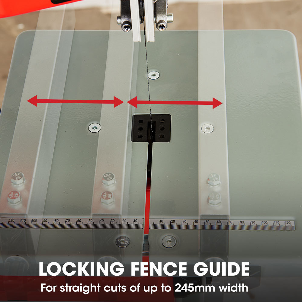- Blade guides for maintaining straight cuts and rapid tension system for easy blade alignment