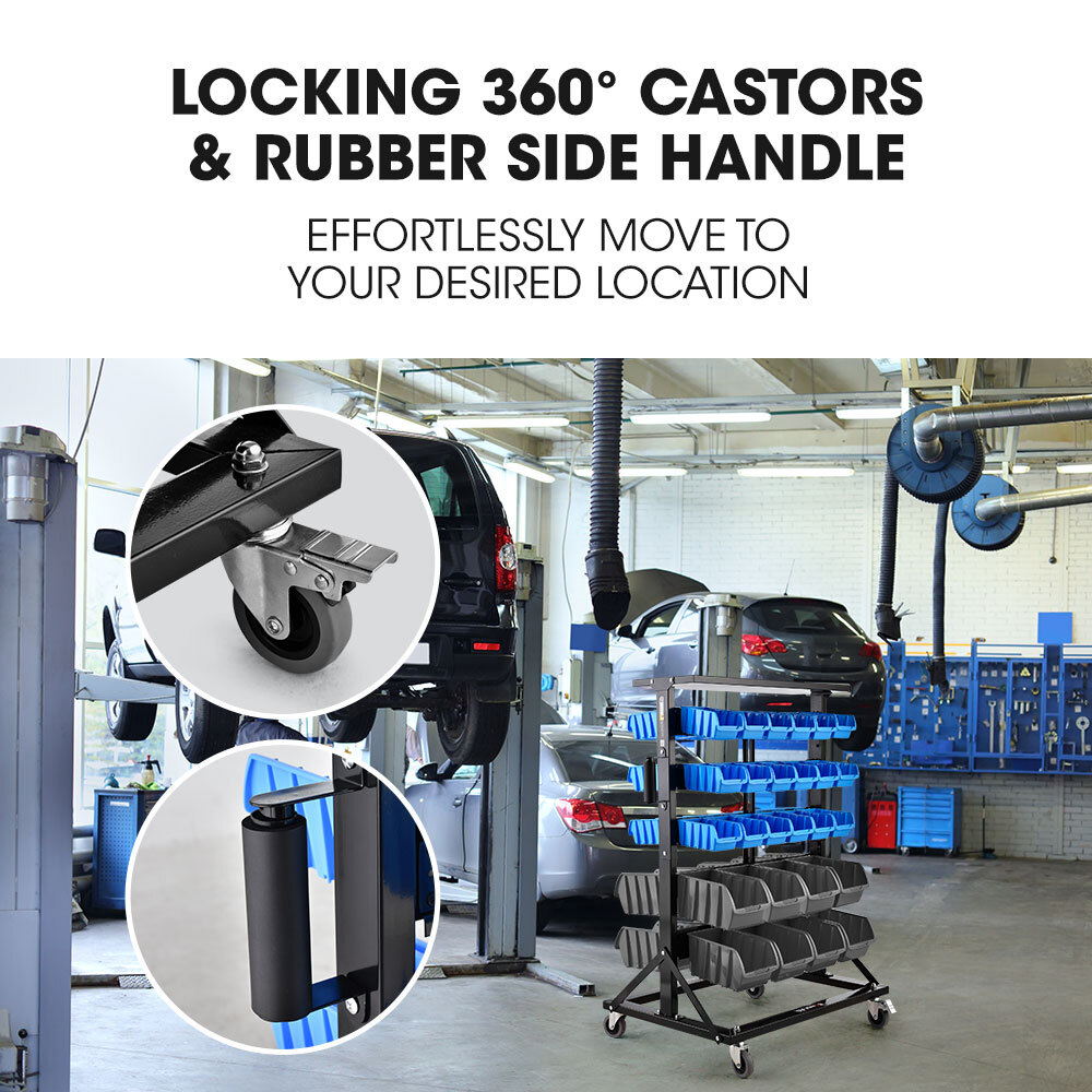 This mobile double-sided bin rack provides an efficient solution for organizing, storing, and accessing small parts and tools. It features multiple tiers and includes numerous bins to accommodate various items, making it suitable for use in garages, workshops, or warehouses.