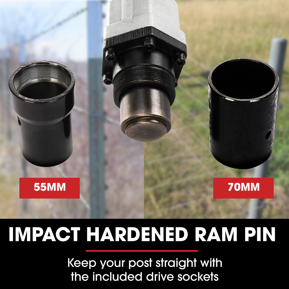 This post driver is designed for driving fence posts, star pickets, and similar objects into the ground, especially suitable for hard or rocky terrain. It features high impact energy and frequency, making post driving faster and more efficient. The compact and lightweight design allows for easy use in tight spaces and portability between job sites.