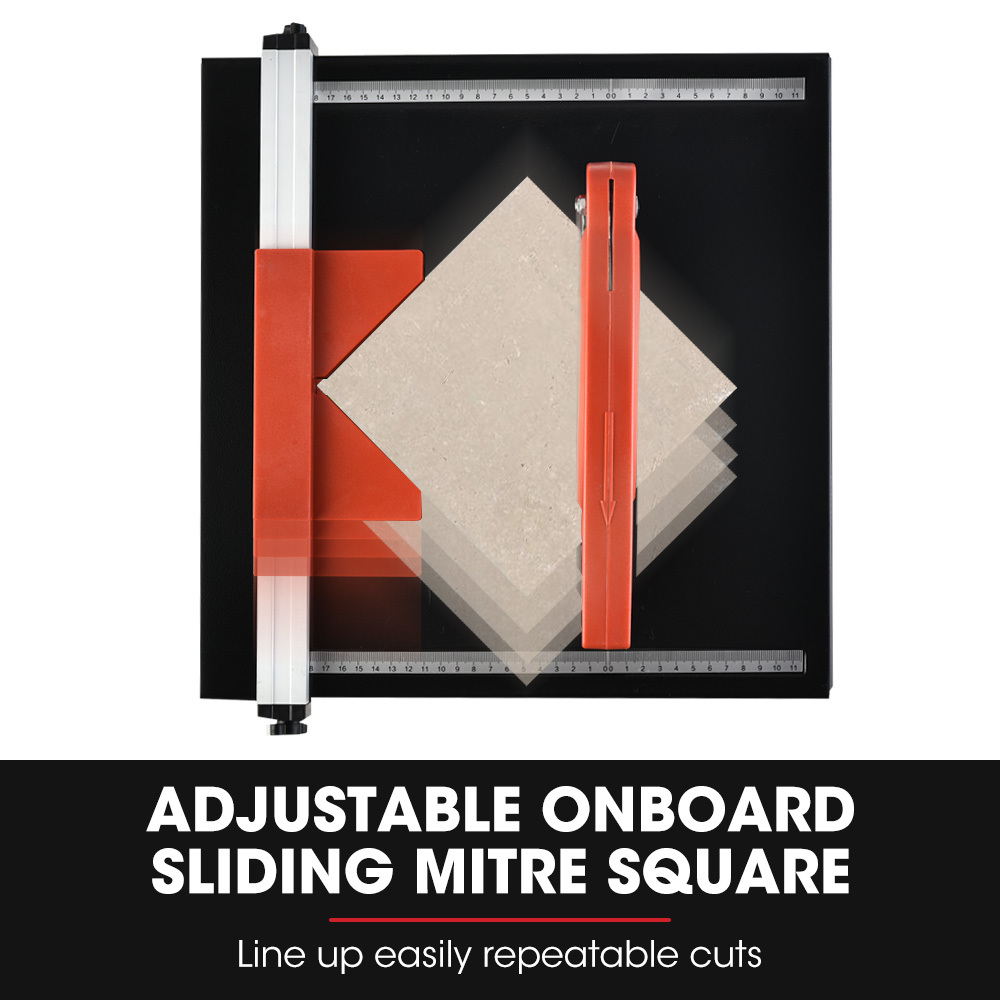 - Wet-cutting system with water reservoir for cleaner cuts and reduced dust