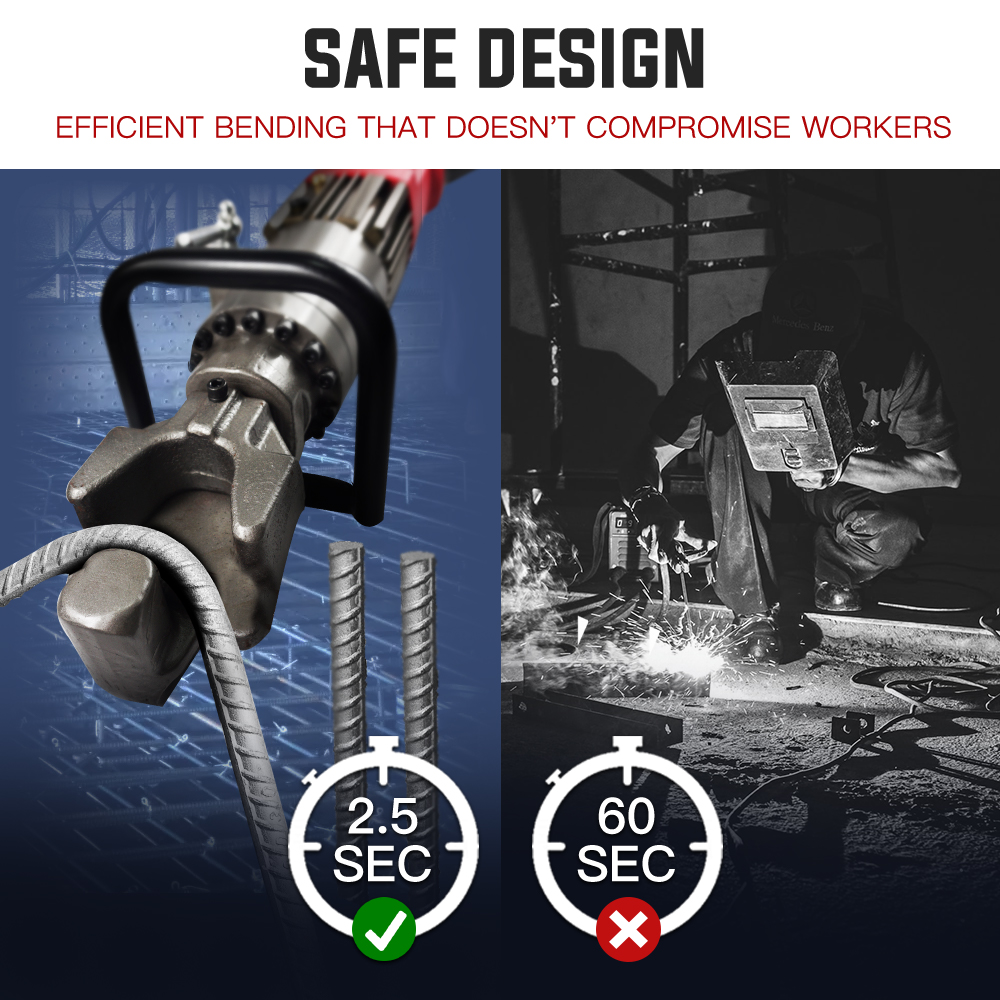 This portable hydraulic rebar bender is designed for efficient and safe bending of rebar, chains, bolts, and rods. It features a robust construction with a lightweight design, making it suitable for use in confined spaces. The tool is equipped with a powerful motor and hydraulic system to ensure quick and reliable operation.