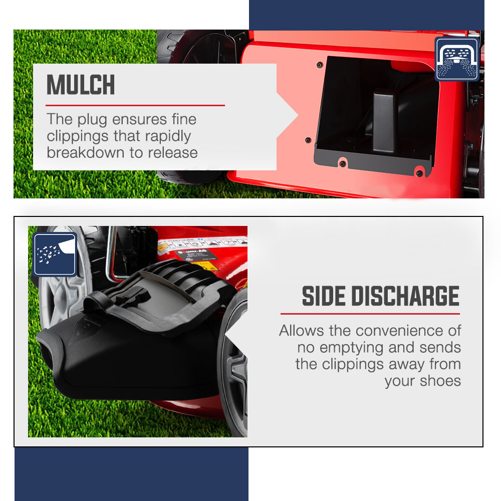 - 4-in-1 functionality: catching, mulching, side discharge, rear discharge