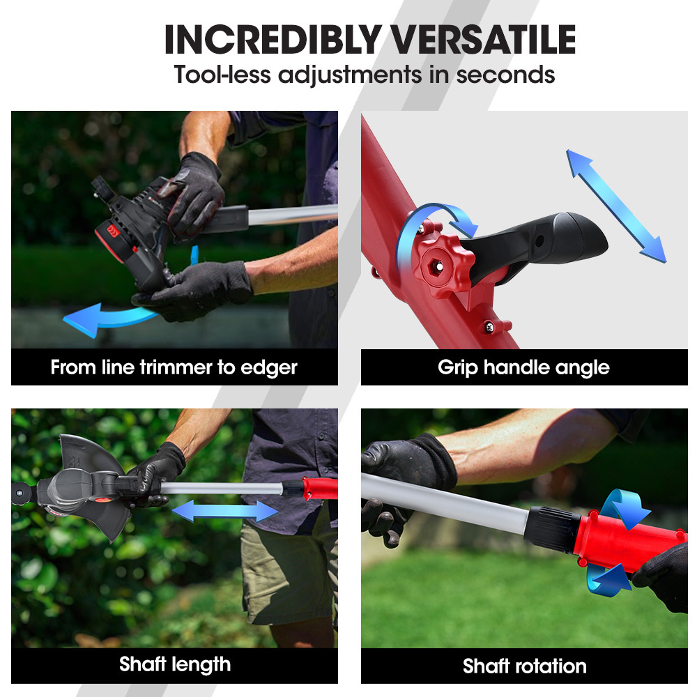 The cordless 2-in-1 line trimmer and lawn edger offers a versatile and portable solution for garden maintenance. It features an adjustable head with a swivel function, allowing it to be used as either a trimmer or an edger. The guide wheel helps achieve neat edging results, and the trimmer line can be easily extended with a push of a button. Its lightweight design and ergonomic features make it easy to handle and operate without mess or fumes.