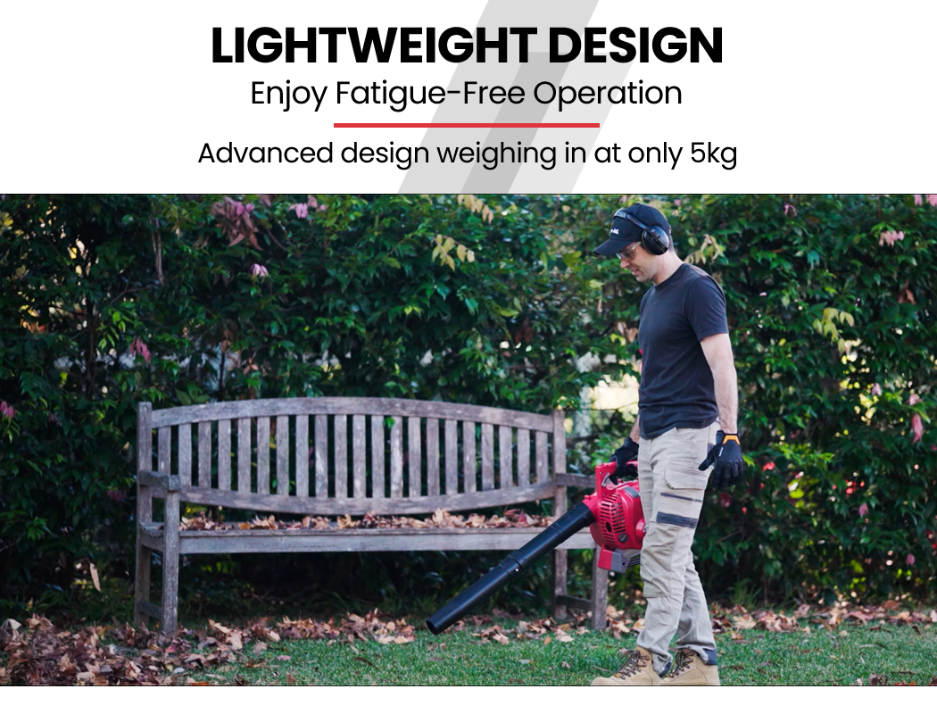 This petrol leaf blower vacuum combines powerful performance with lightweight design, making yard cleanup tasks easier and more efficient. It features a versatile blower and vacuum function, allowing you to clear debris or vacuum leaves and dirt for composting. The unit is designed for ease of use, maneuverability, and minimal fatigue during extended use.