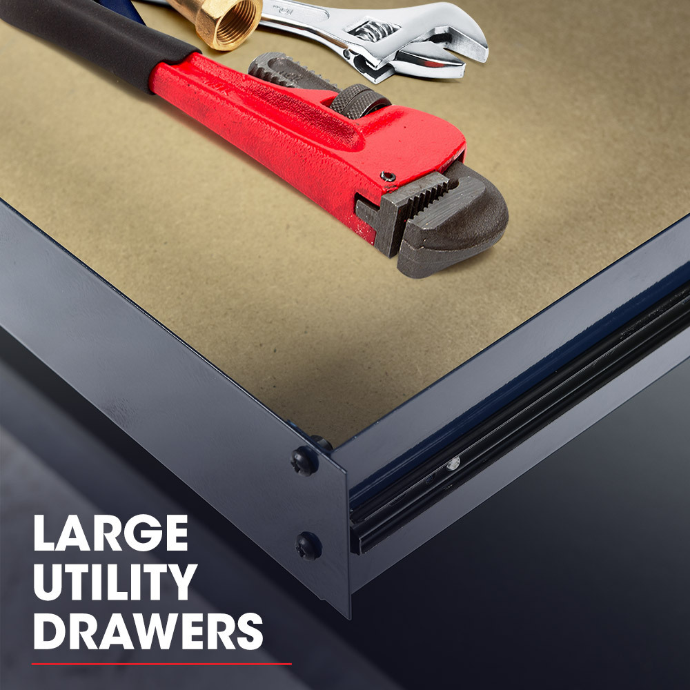 The steel workbench with integrated LED lights and pegboard offers a durable and organized workspace solution. It features a high load capacity, corrosion-resistant coating, and versatile storage options, making it suitable for various workshop or garage environments.