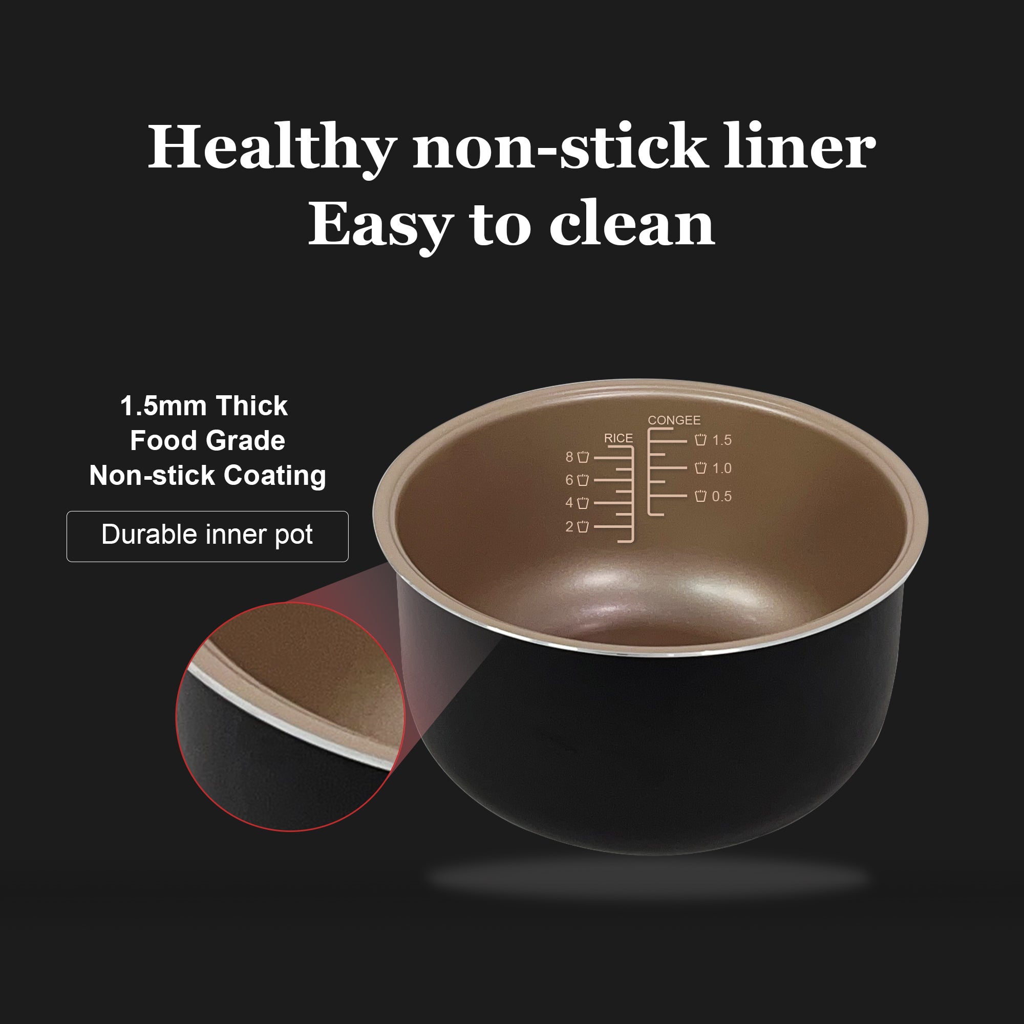 This rice cooker features an easy-to-read LED display panel and provides extensive heating coverage for even cooking. It is equipped with a dual layer of non-stick material for durability and easy cleaning. The automatic keep-warm function ensures rice stays warm after cooking, and the detachable inner lid allows for convenient cleaning. The product complies with Australian standards and has been ERAC certified.