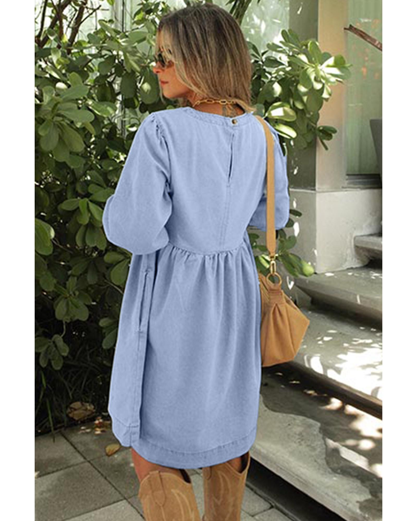 This denim babydoll mini dress features a stylish square neckline and a flared silhouette, making it a versatile and fashionable choice for various occasions. The front button detail adds a charming touch to the overall design, while the denim fabric provides durability and comfort.