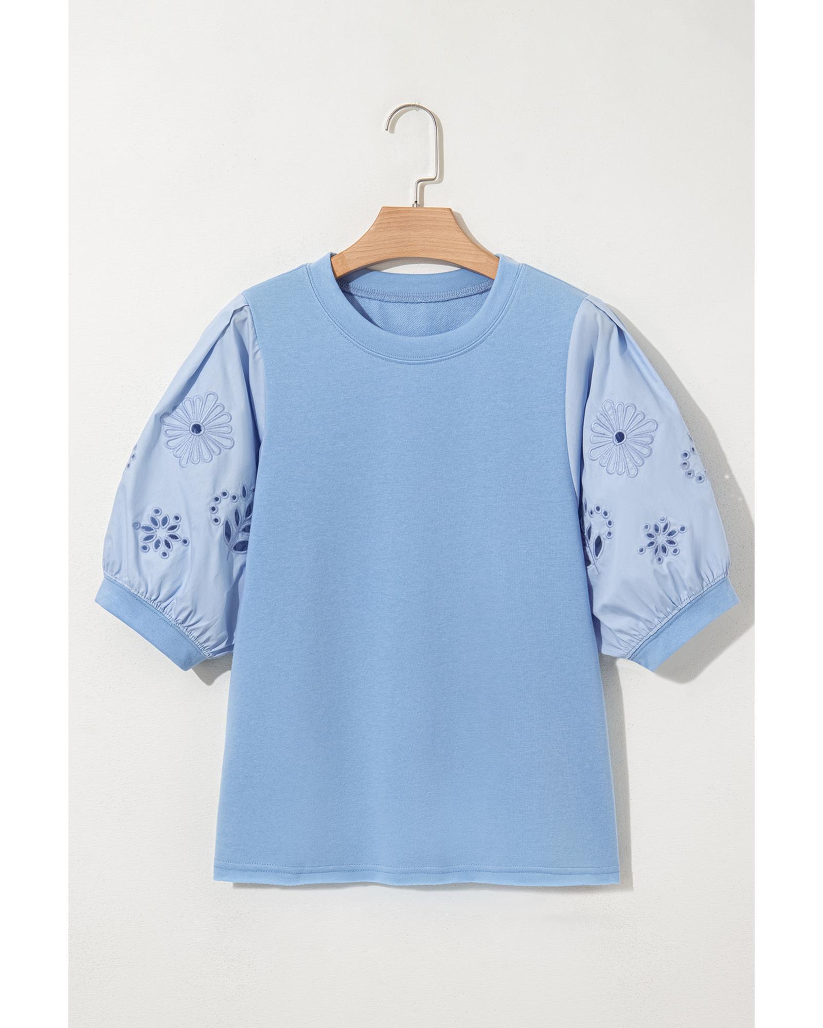 Beau Blue Eyelet Flower Embroidered Puff Short Sleeve Patchwork Crew Neck Blouse – L