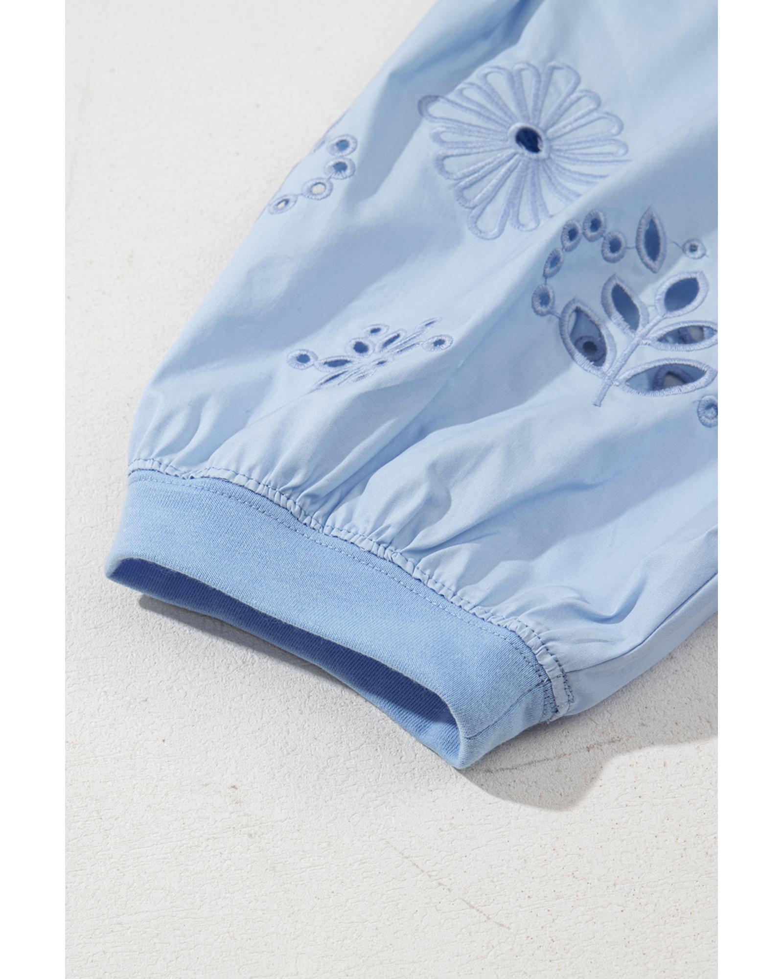 This blouse features intricate eyelet flower embroidery and patchwork puff short sleeves, offering a stylish and comfortable look. Its crew neck design and relaxed fit make it suitable for both casual and dressy occasions. Crafted from lightweight and soft materials, it provides all-day comfort and versatility. The blouse pairs well with various pants, skirts, and bottoms for a complete outfit.