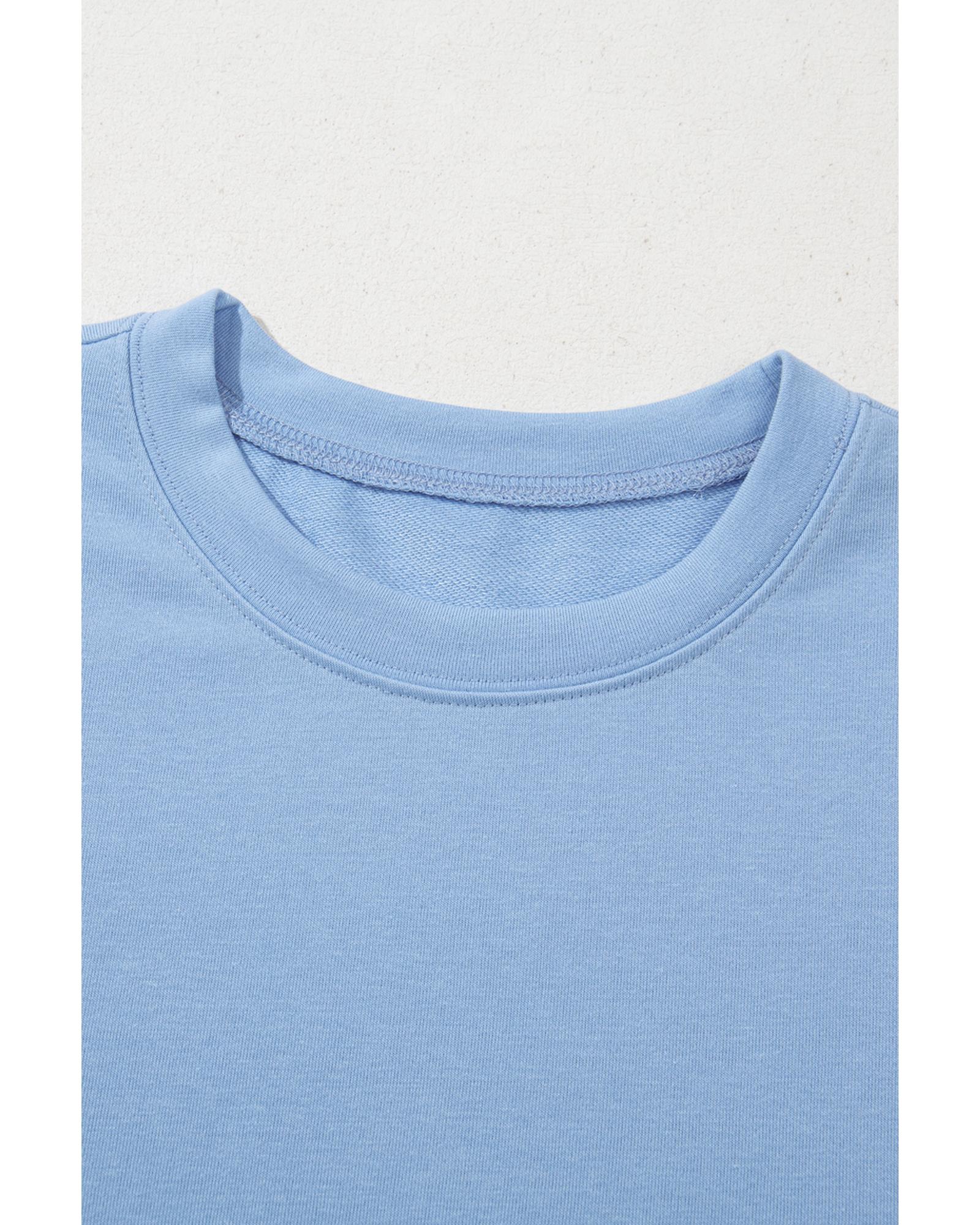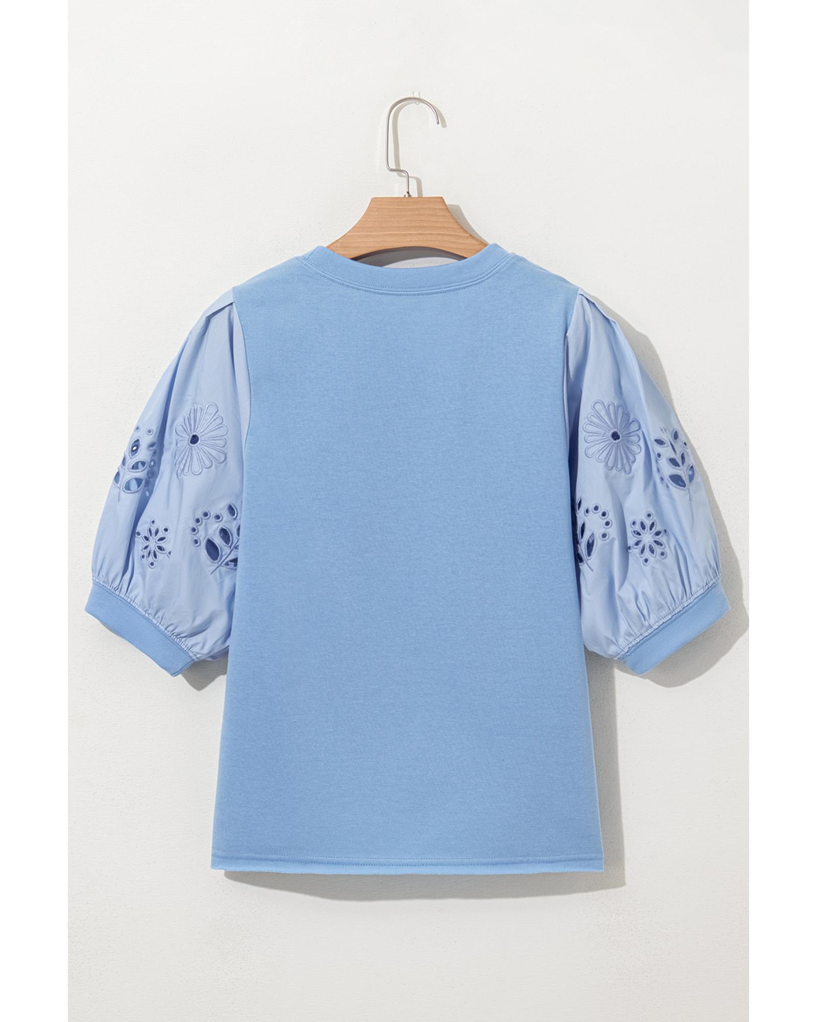 Beau Blue Eyelet Flower Embroidered Puff Short Sleeve Patchwork Crew Neck Blouse – XL