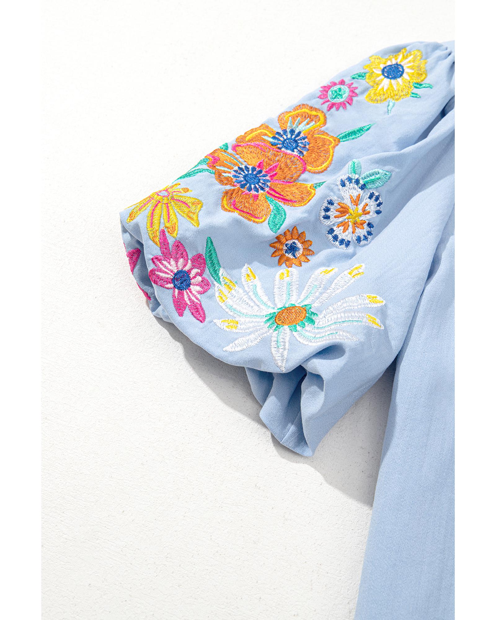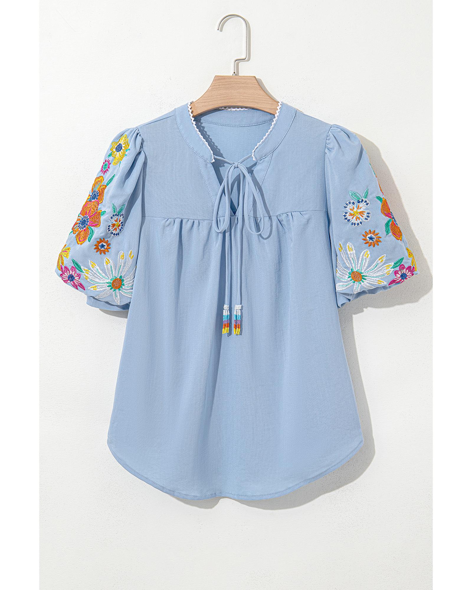 Beau Blue Floral Embroidered Puff Sleeve Split Neck Blouse – M