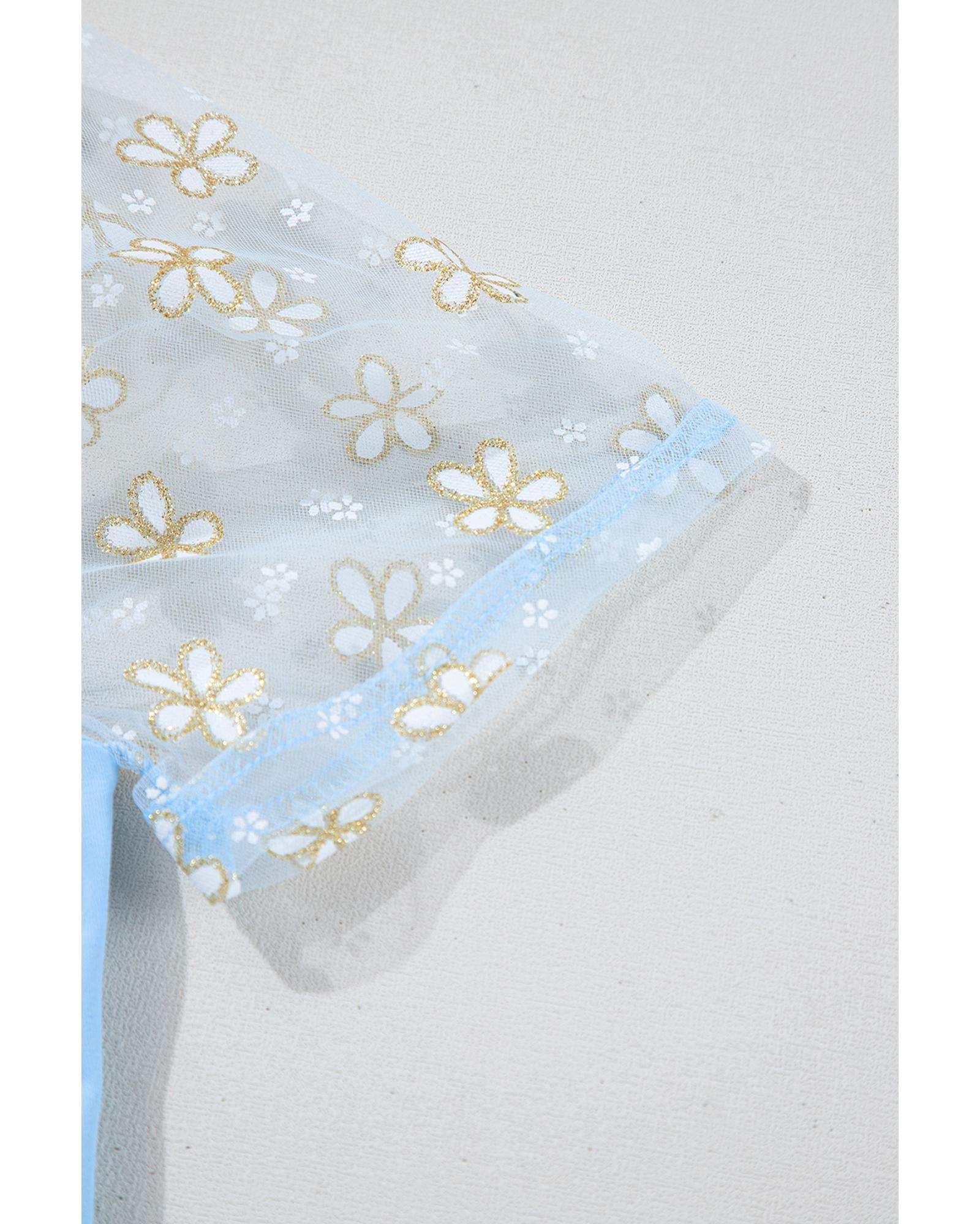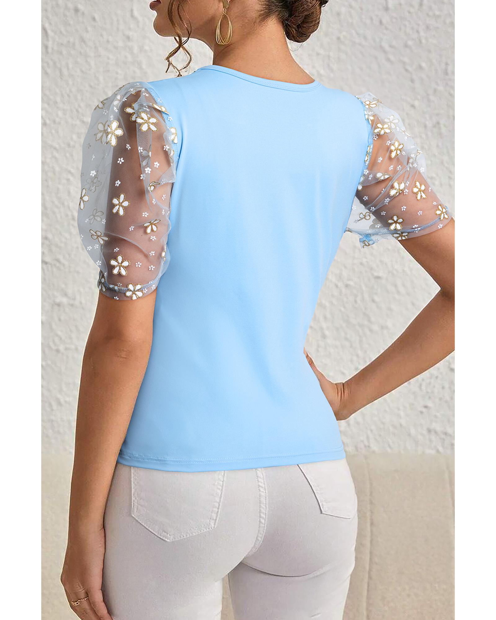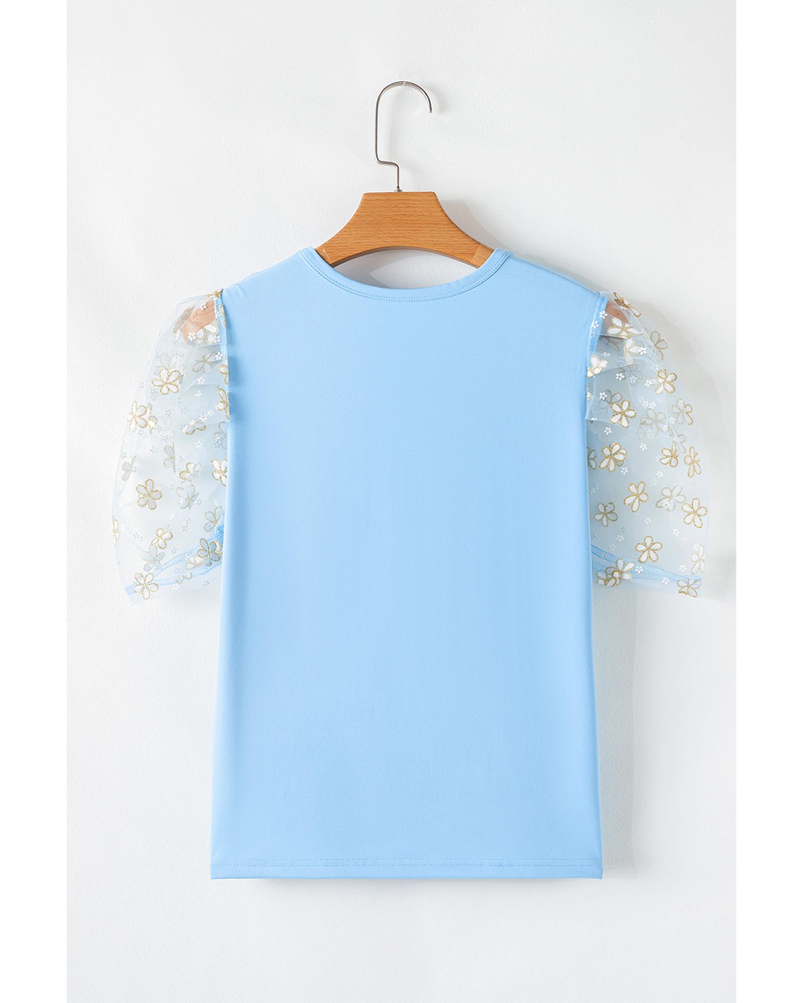 Beau Blue Floral Mesh Puff Sleeve Crew Neck Top – L