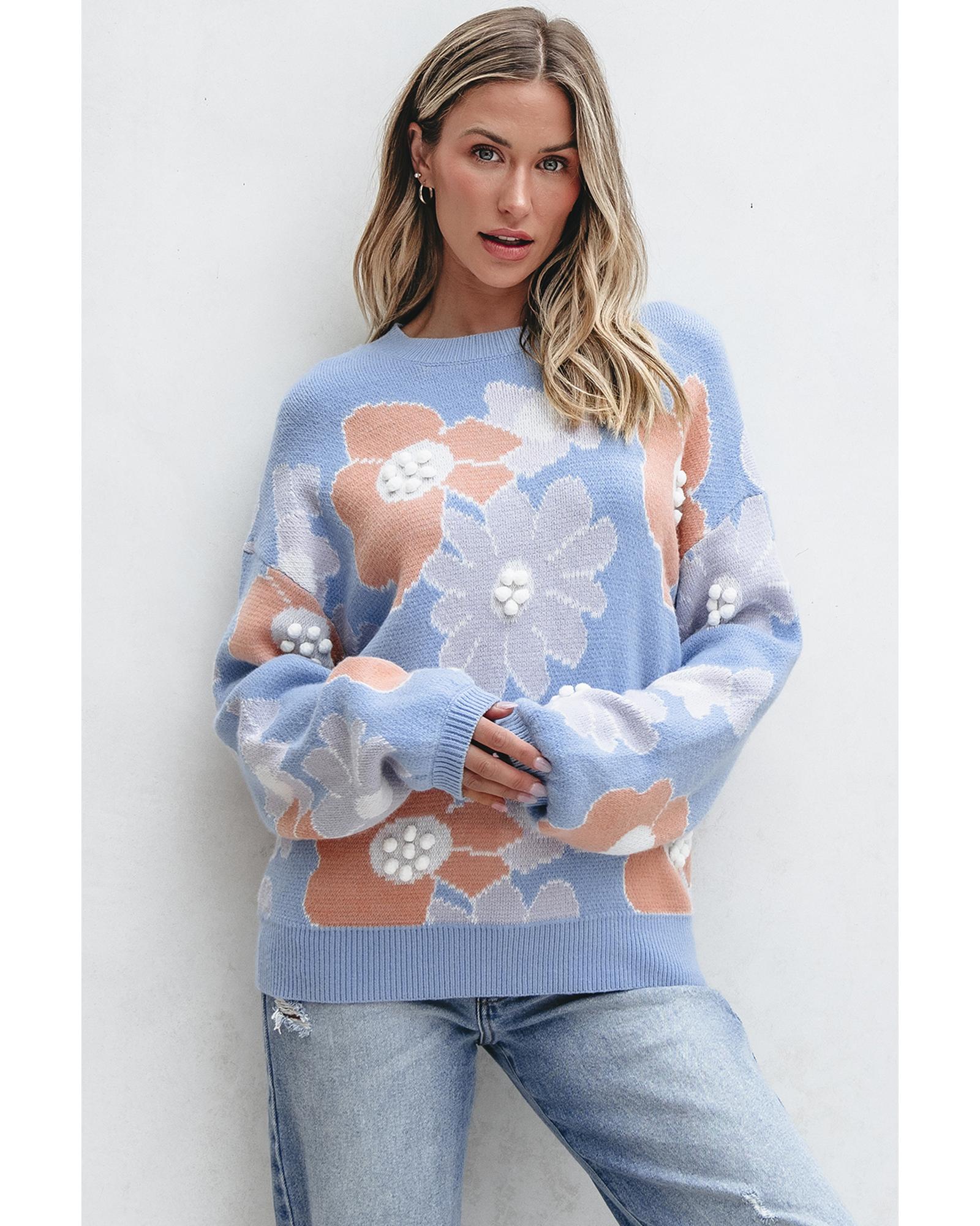Beau Blue Floral O Neck Drop Shoulder Knitted Sweater – XL