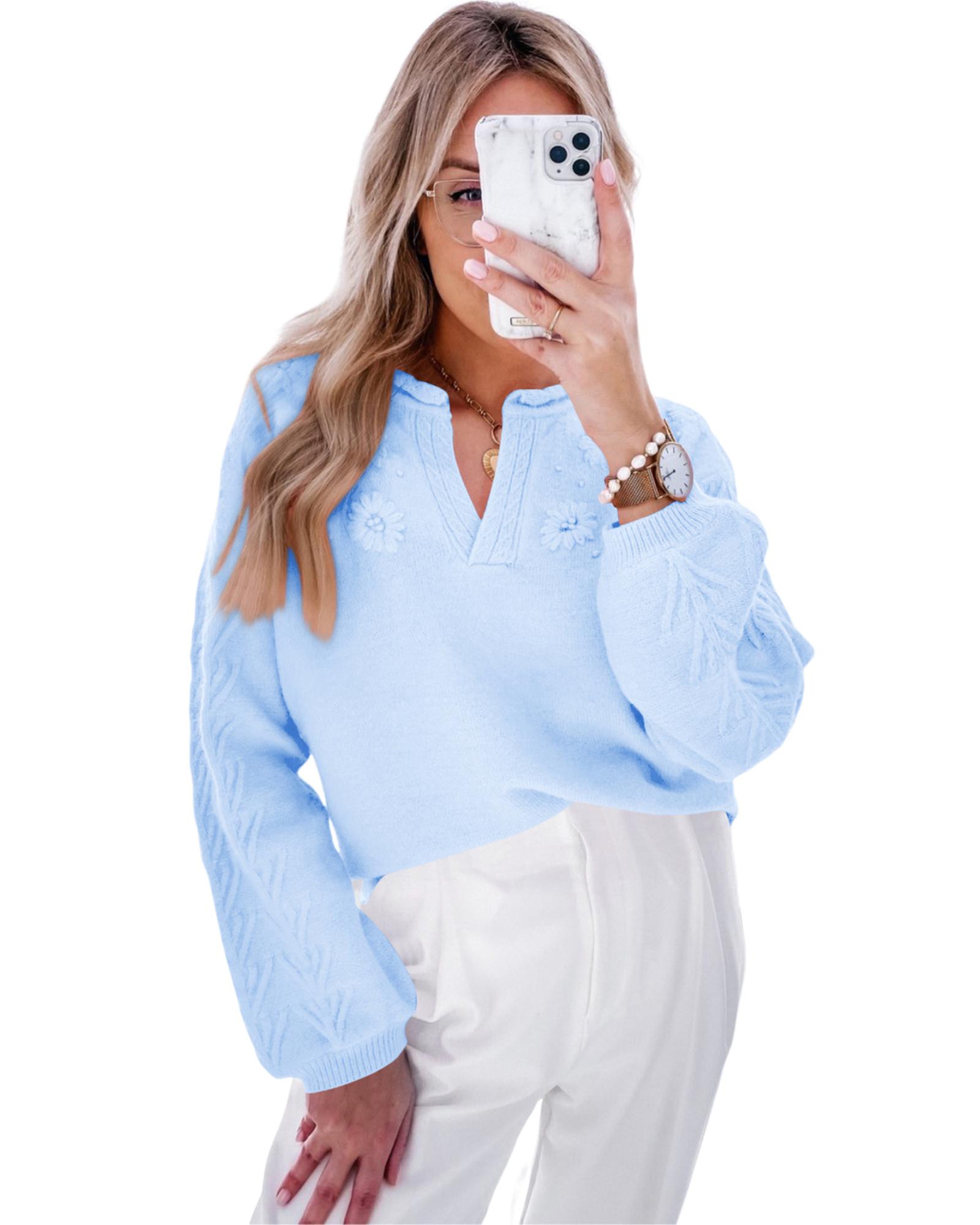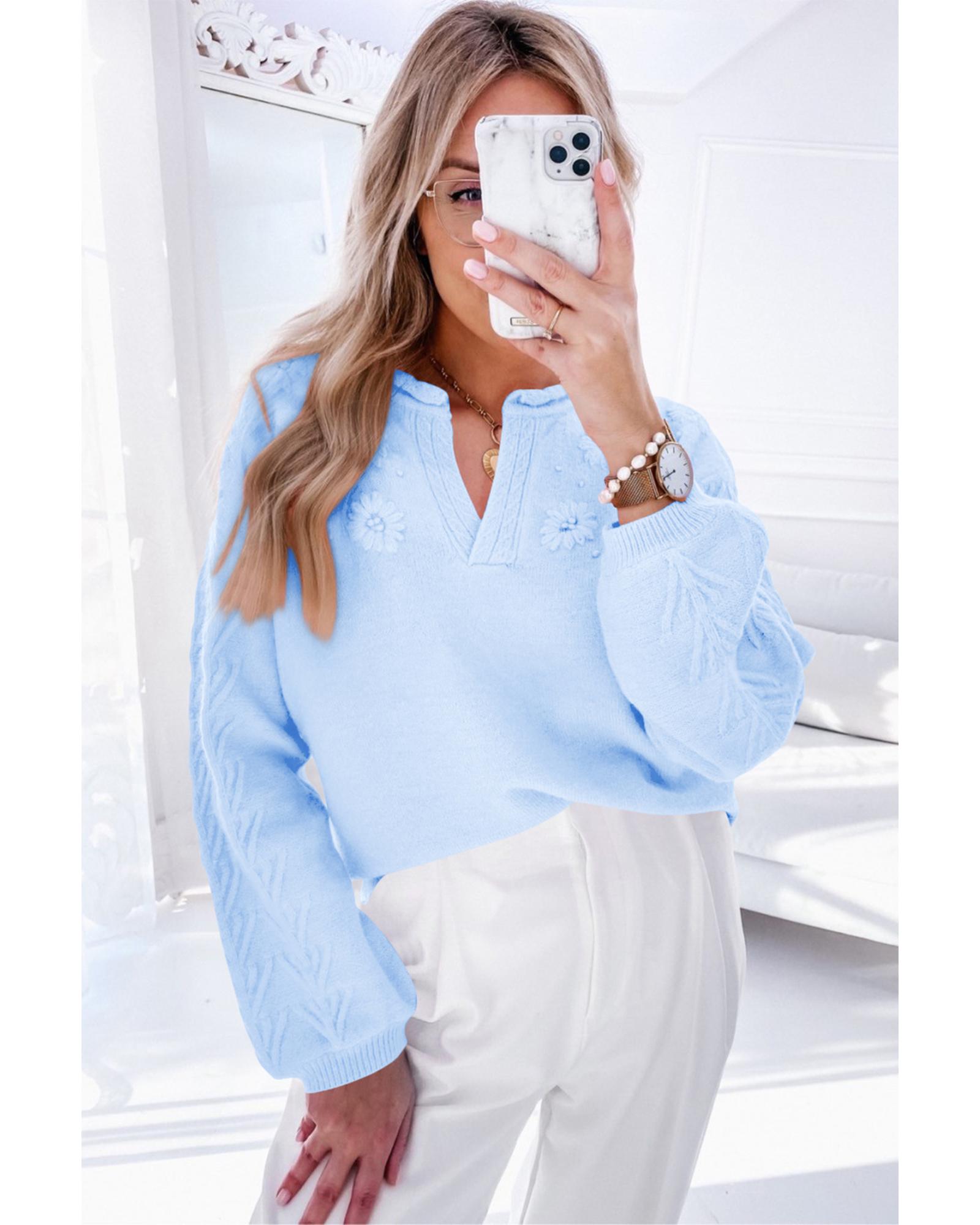 This sweater features a stylish knitted design with a feminine puff sleeve and a modern notched neck. The beautiful floral pattern adds a charming touch, making it a versatile addition to your wardrobe. Crafted for warmth and comfort, it combines fashion with functionality.
