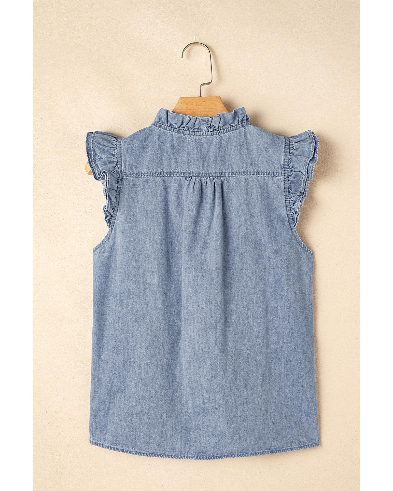 This chambray tank top features a playful frilly ruffle trim and a flattering V neckline, making it a versatile addition to your warm-weather wardrobe. Crafted from a comfortable blend of cotton and polyester, it is suitable for casual wear and layering.