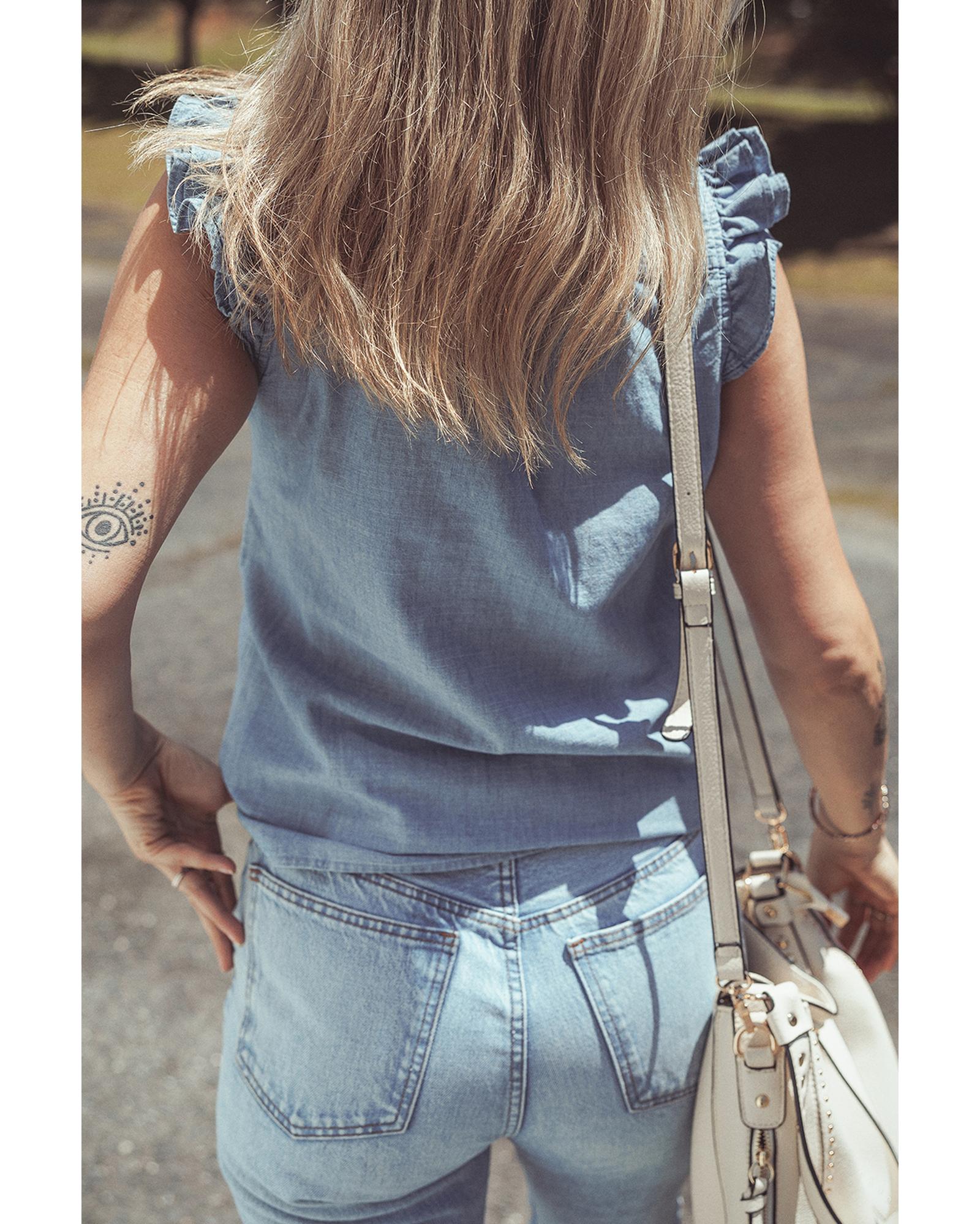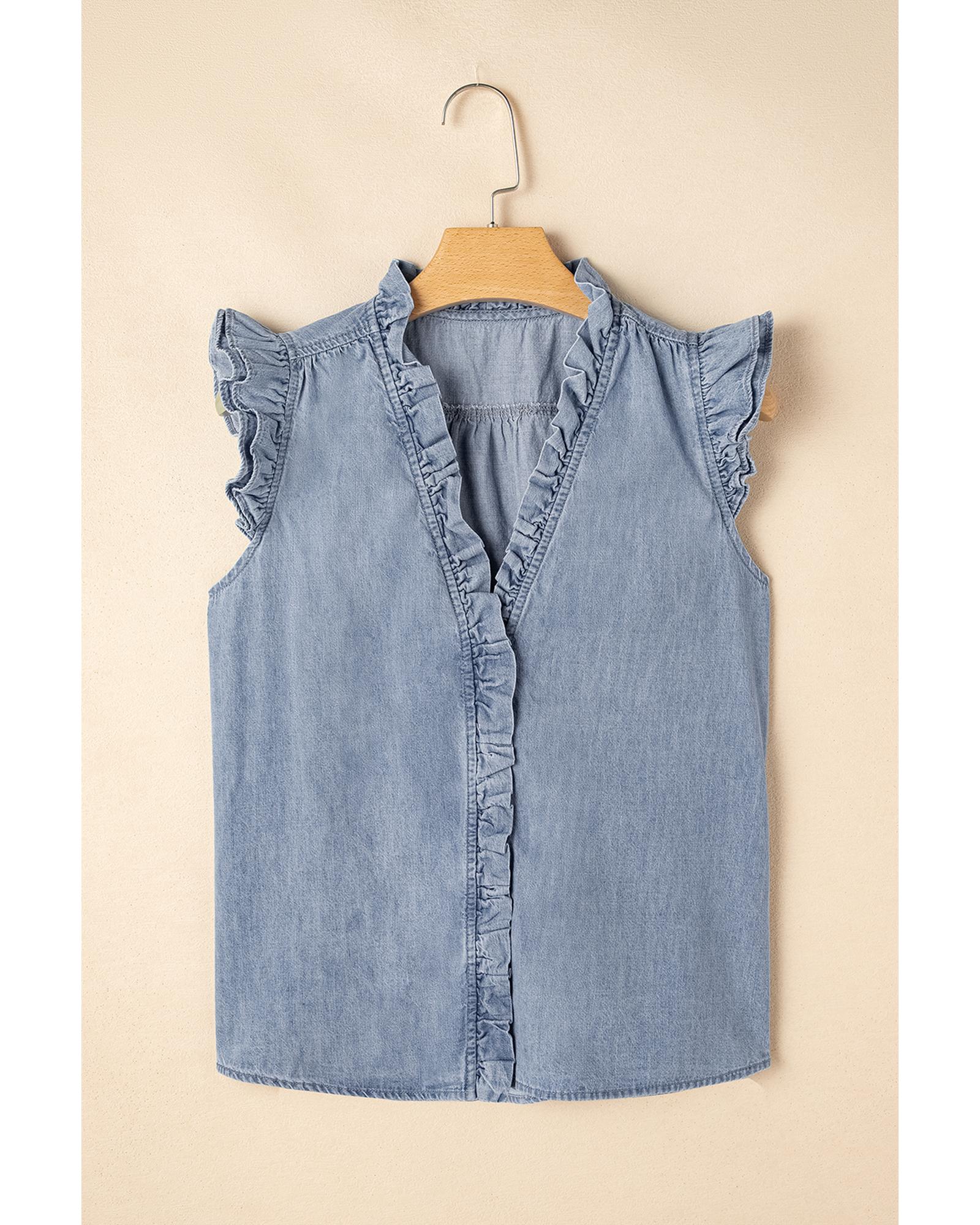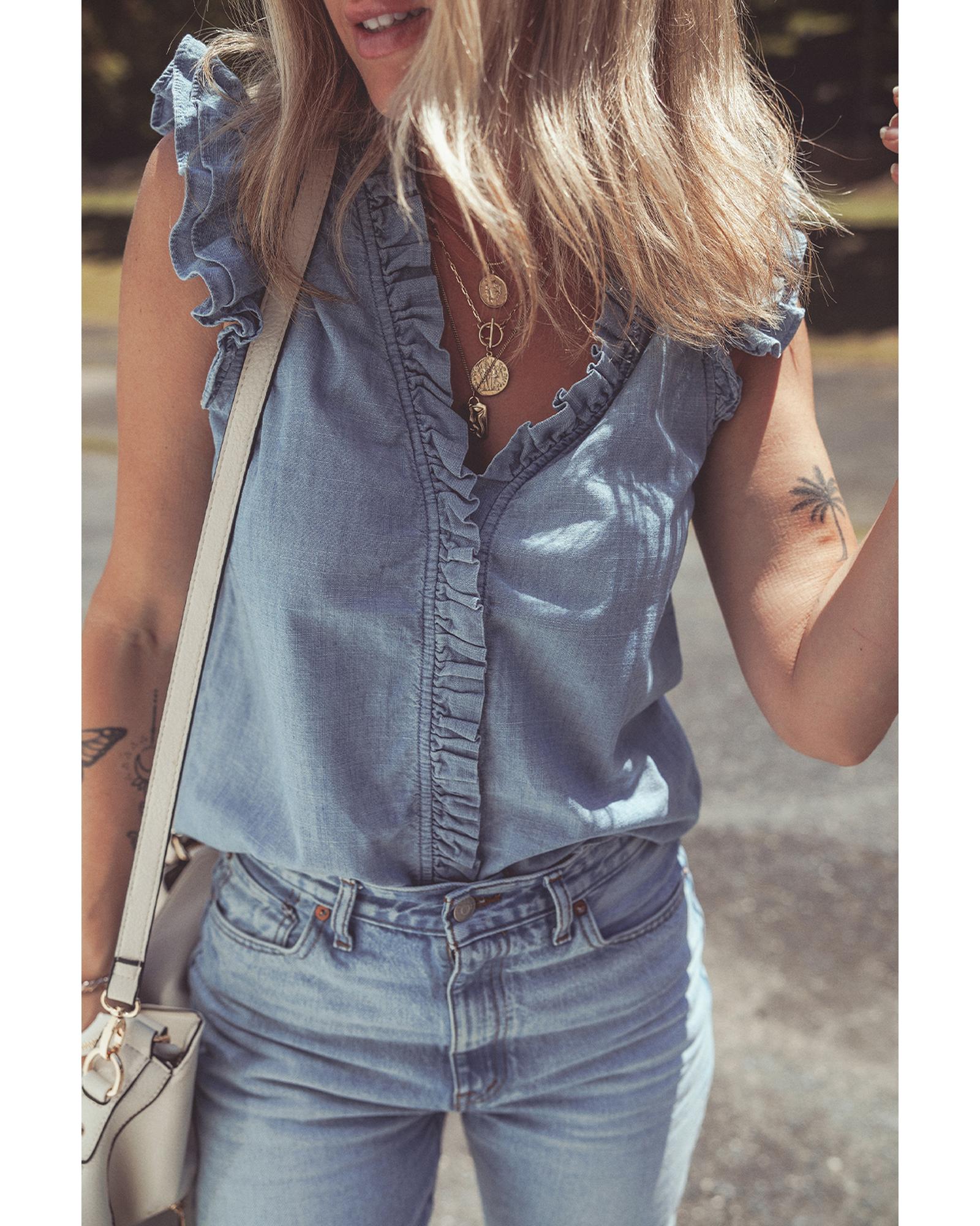 This chambray tank top features a playful frilly ruffle trim and a flattering V neckline, making it a versatile addition to your wardrobe. Crafted from a comfortable blend of cotton and polyester, it is ideal for warm weather and layering outfits.