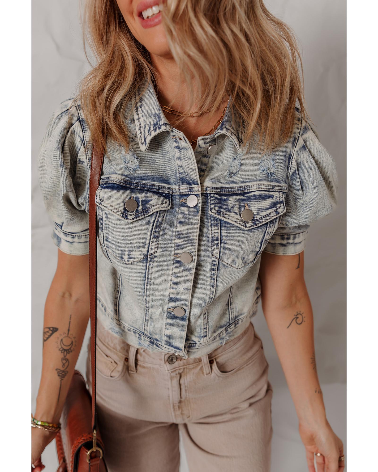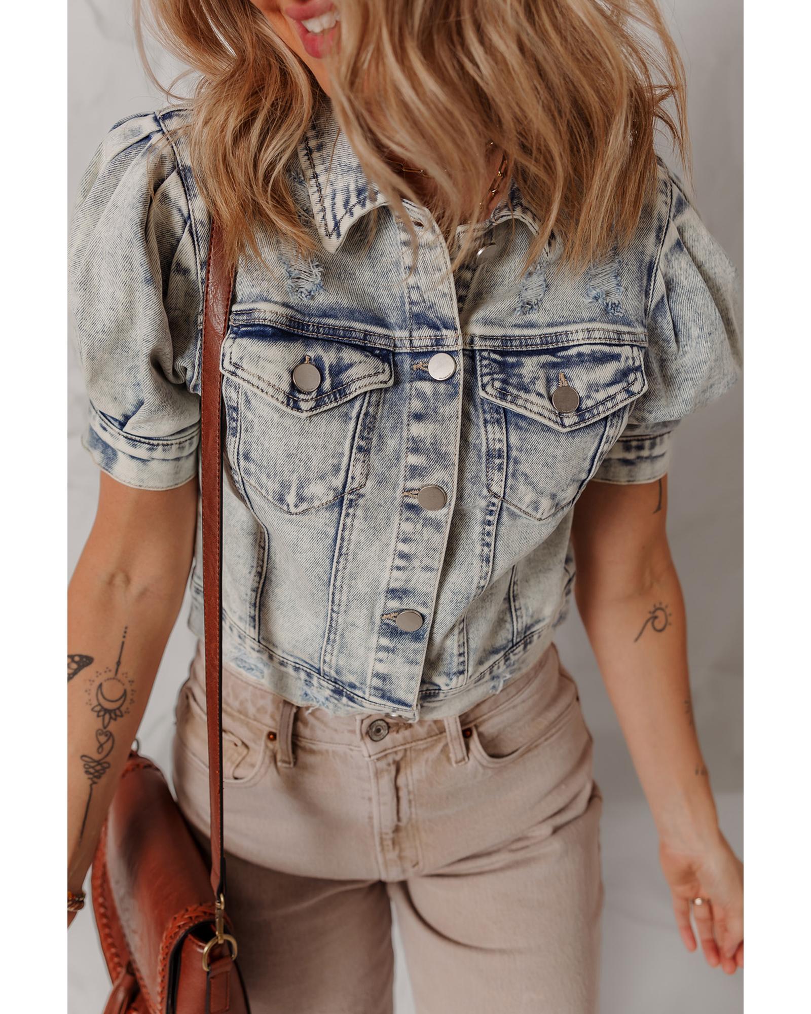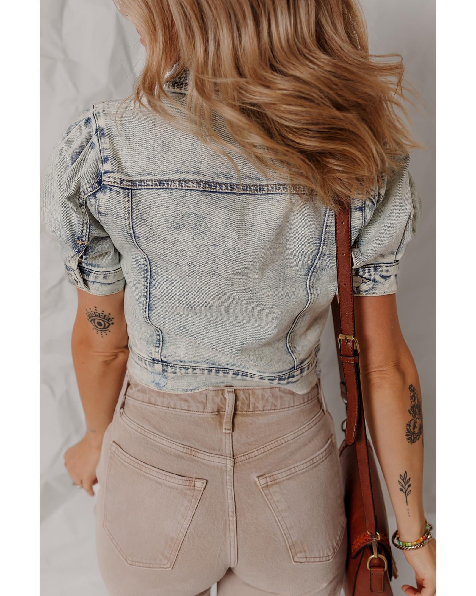 This denim jacket features a stylish light wash finish and a classic collared design, making it a versatile addition to any wardrobe. The puff sleeves and chest pocket details add fashionable touches, while the cropped silhouette pairs well with high-waisted pants for a trendy look.