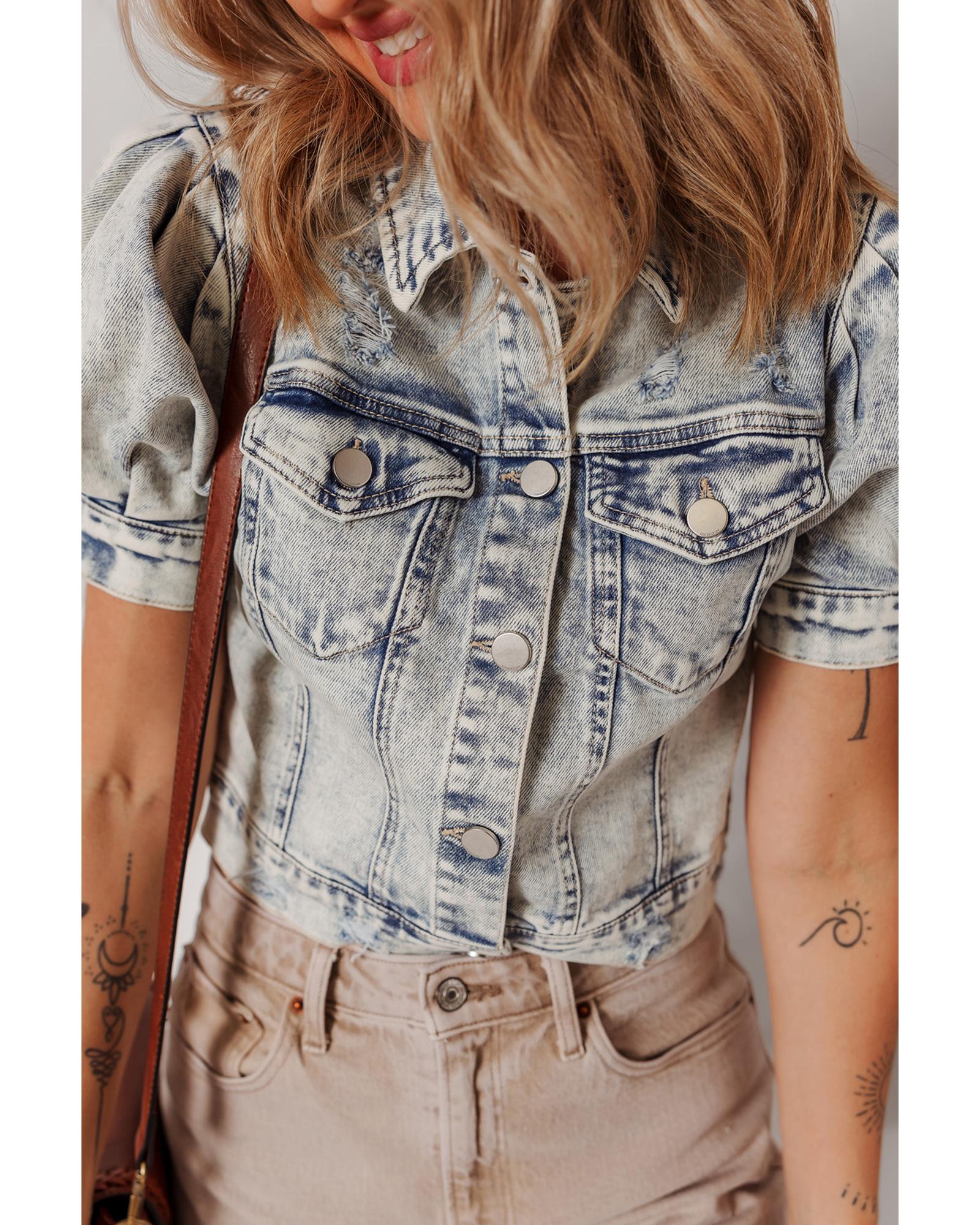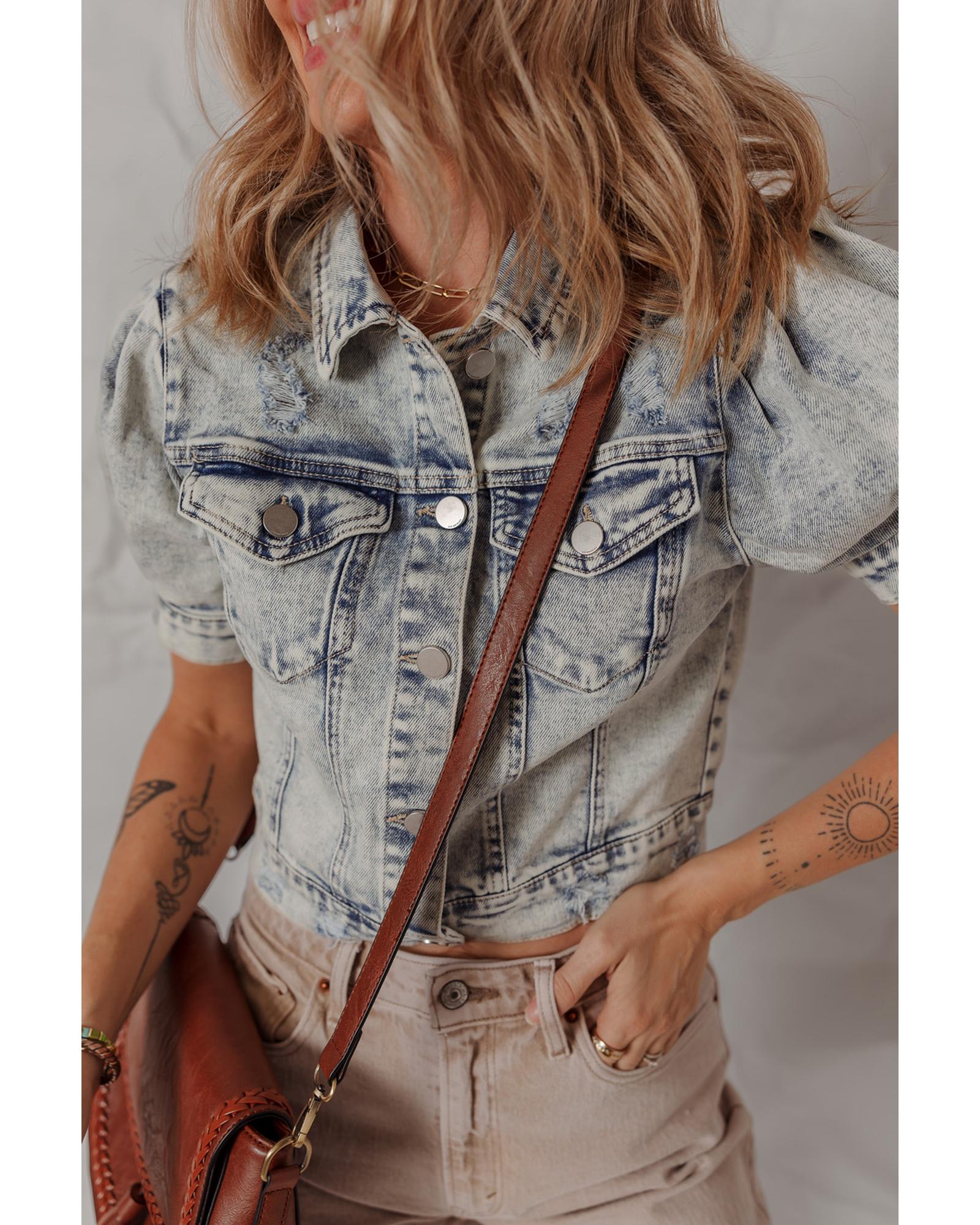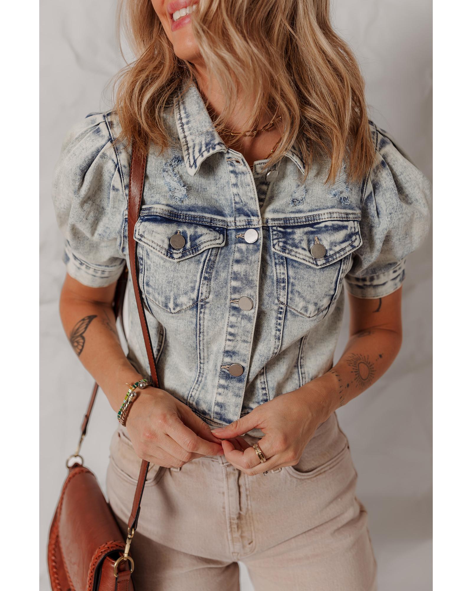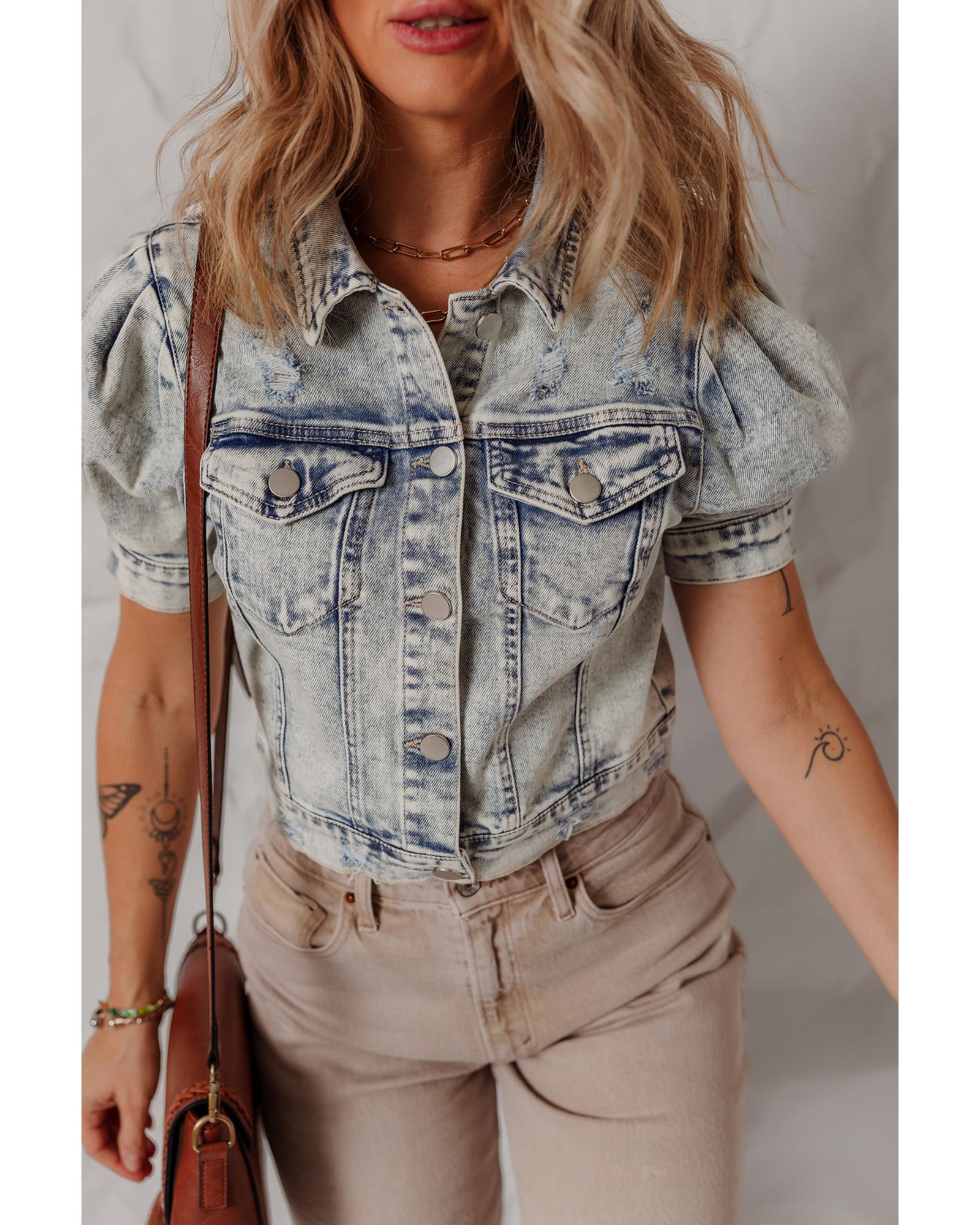 This denim jacket features a stylish light wash finish and a classic collared design, making it a versatile addition to any wardrobe. The puff sleeves and chest pocket details add fashionable touches, while the cropped silhouette pairs well with high-waisted pants for a trendy look.