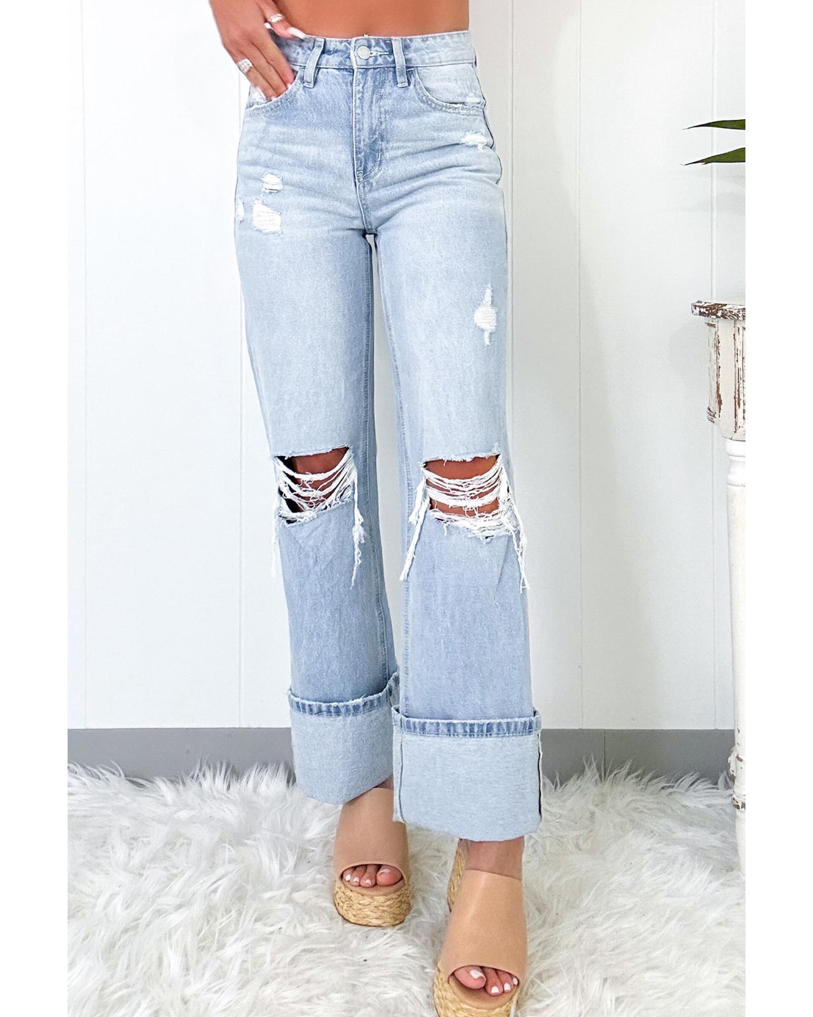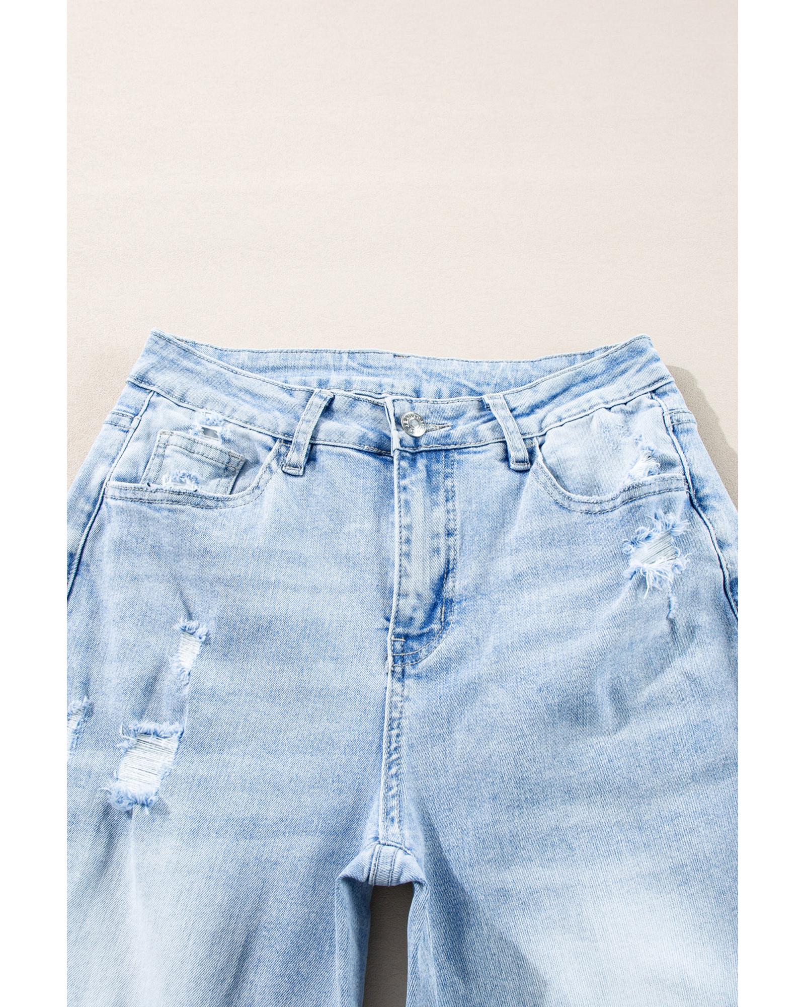 These distressed flare jeans feature a light wash with a vintage-inspired design, offering a flattering silhouette that combines a trendy fit with nostalgic style. Crafted with high elasticity for comfort, they are suitable for a fashionable 90s-inspired look.