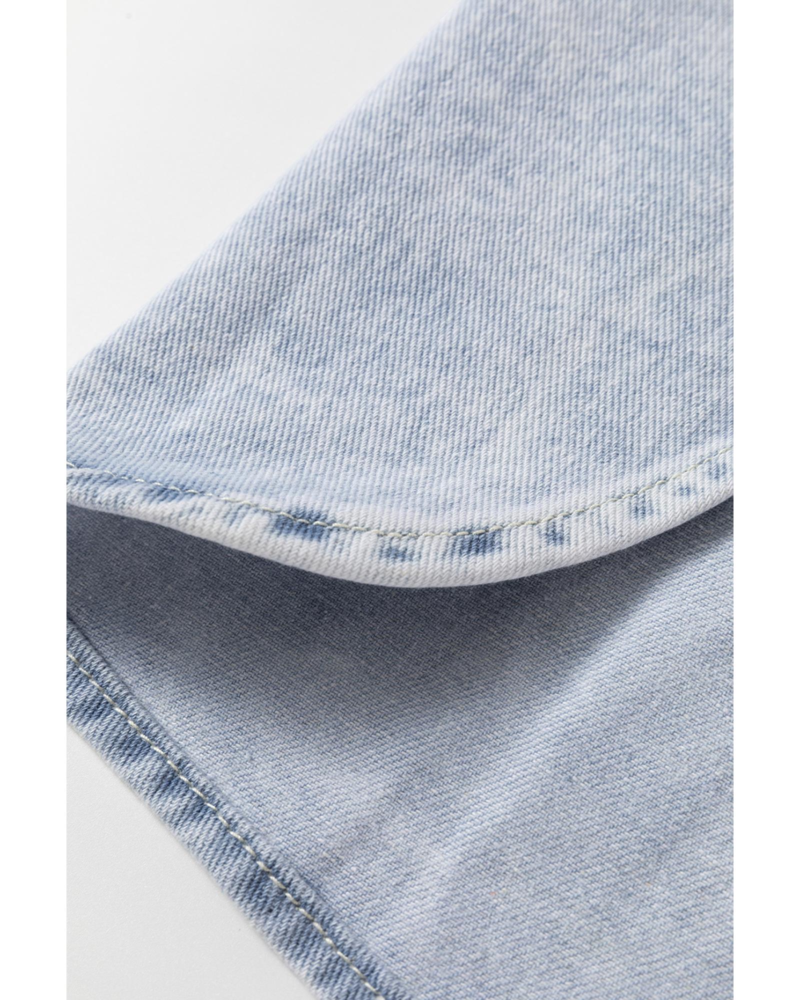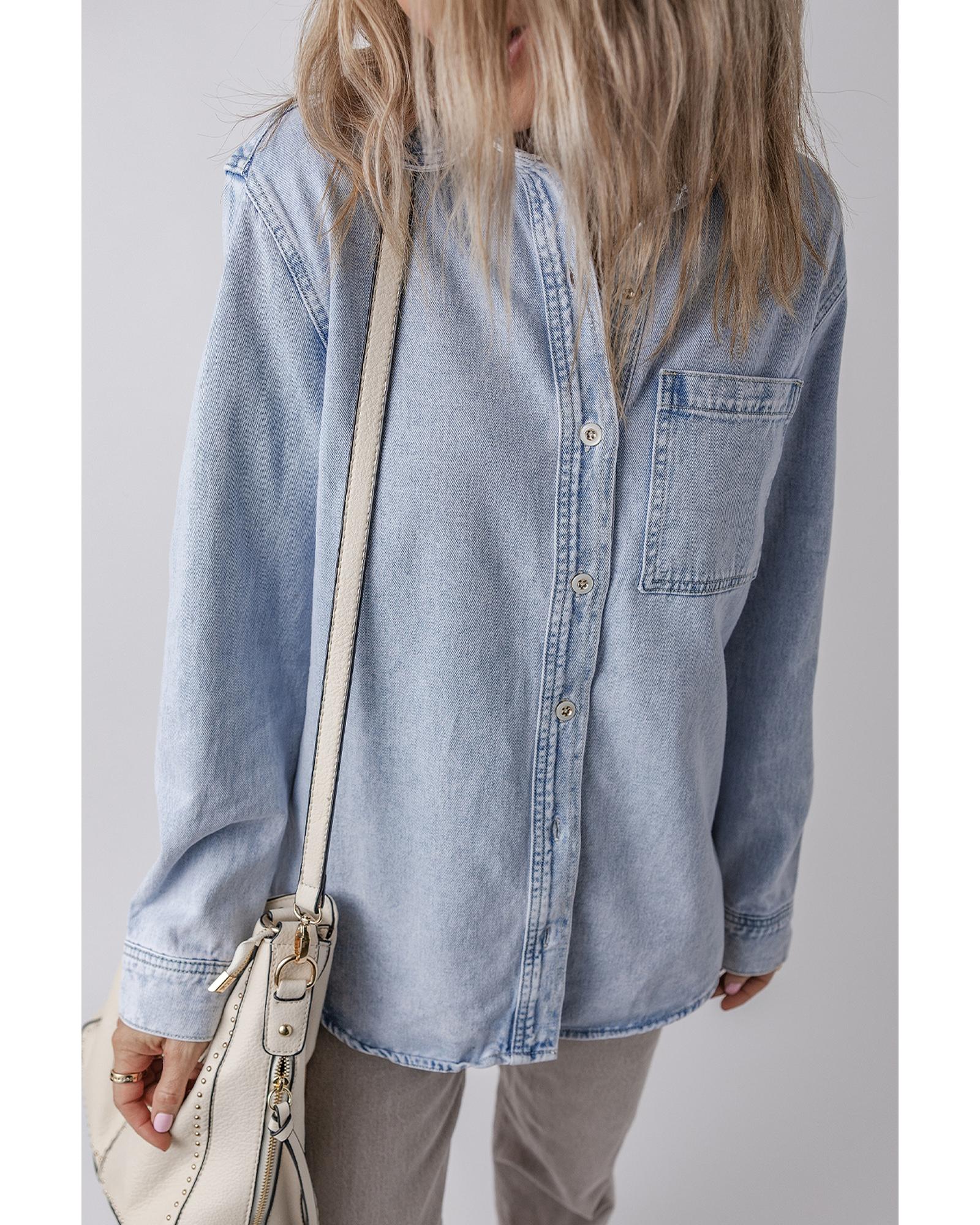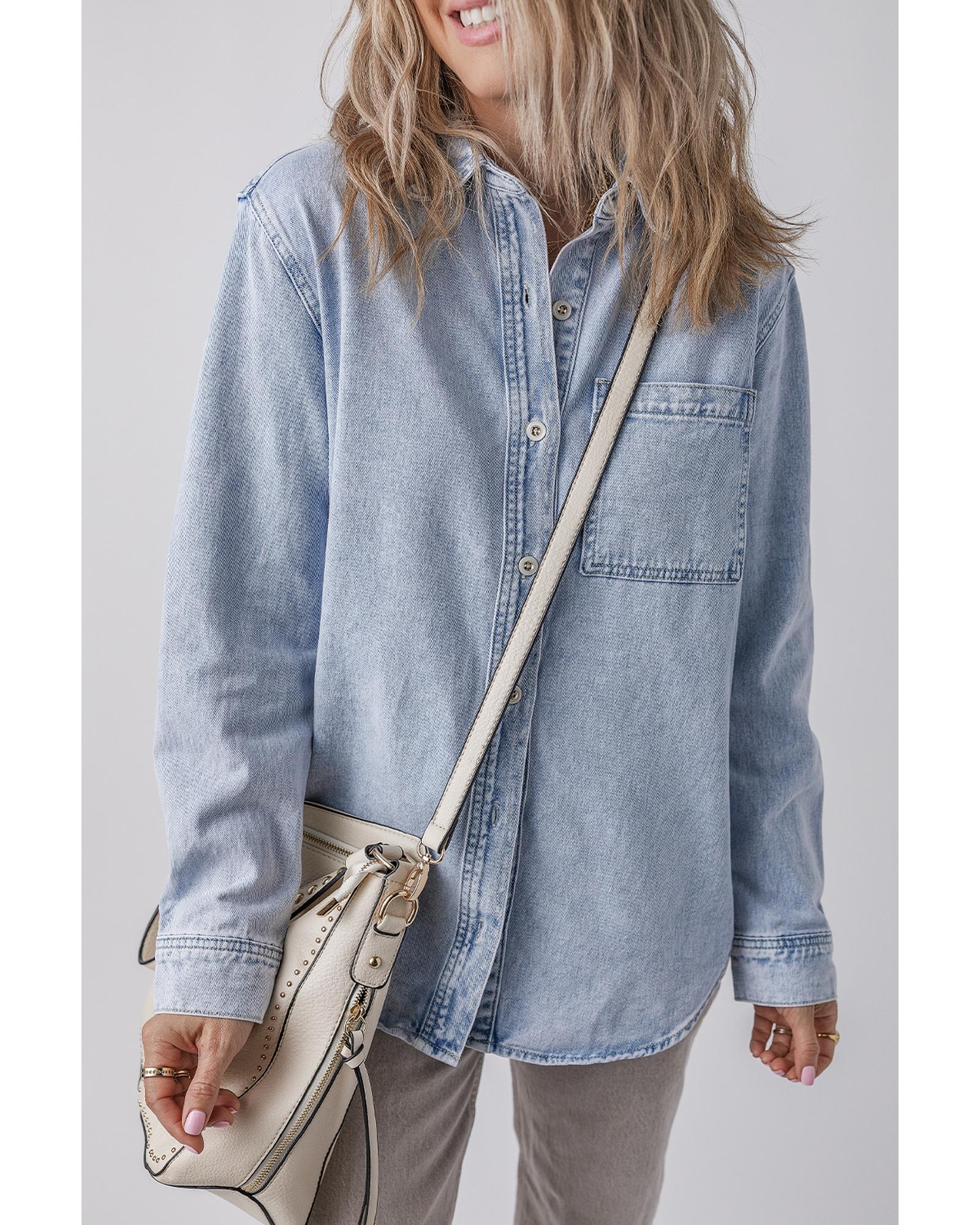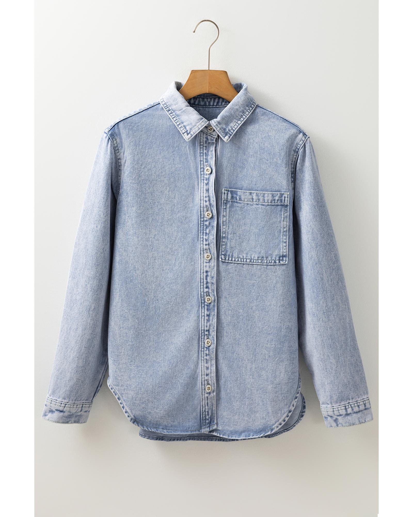 This long sleeve denim shacket combines a trendy fitted design with versatile functionality, making it suitable for various seasons and occasions. It features classic styling elements with practical details for everyday wear.