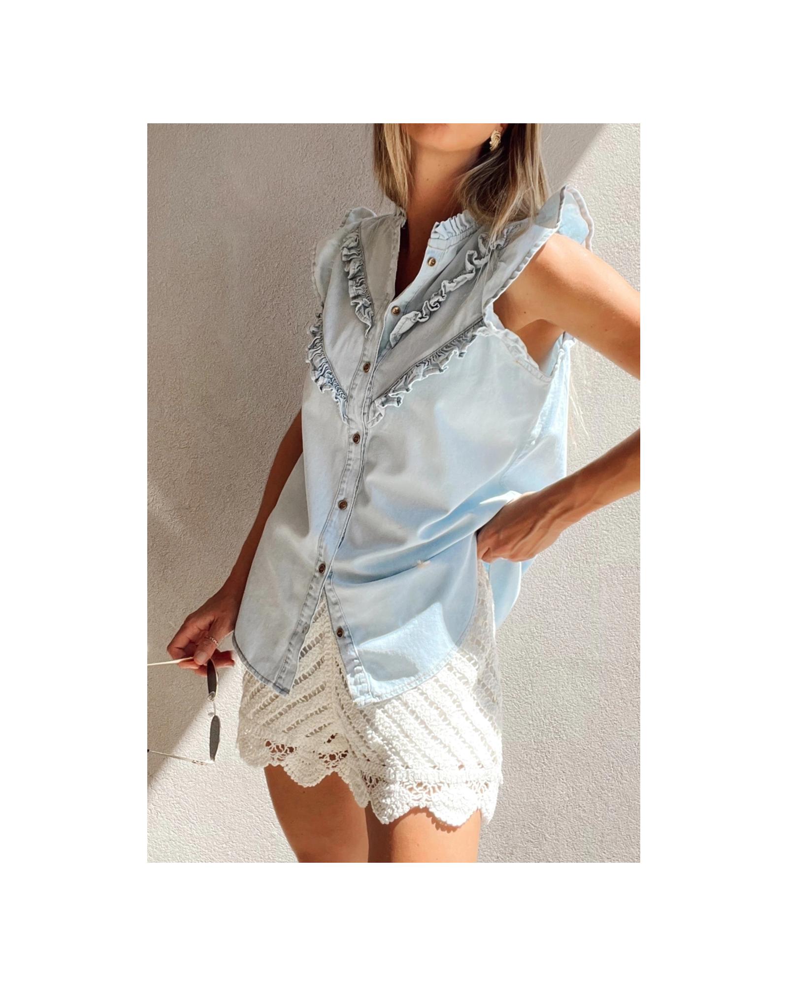 This denim shirt features a mineral wash finish and a stylish frilled trim, offering a feminine and trendy look. The cap sleeves add a delicate touch, making it suitable for casual and semi-formal occasions. Designed with a classic button-up front, it combines comfort with timeless style. Available in various sizes to fit different preferences.