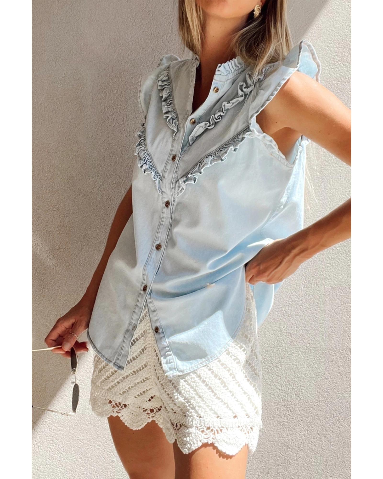 This denim shirt features a mineral wash finish and a stylish frilled trim, offering a feminine and trendy look. Designed with cap sleeves and a classic button-up front, it combines comfort with fashionable details. Available in various sizes to suit different preferences.