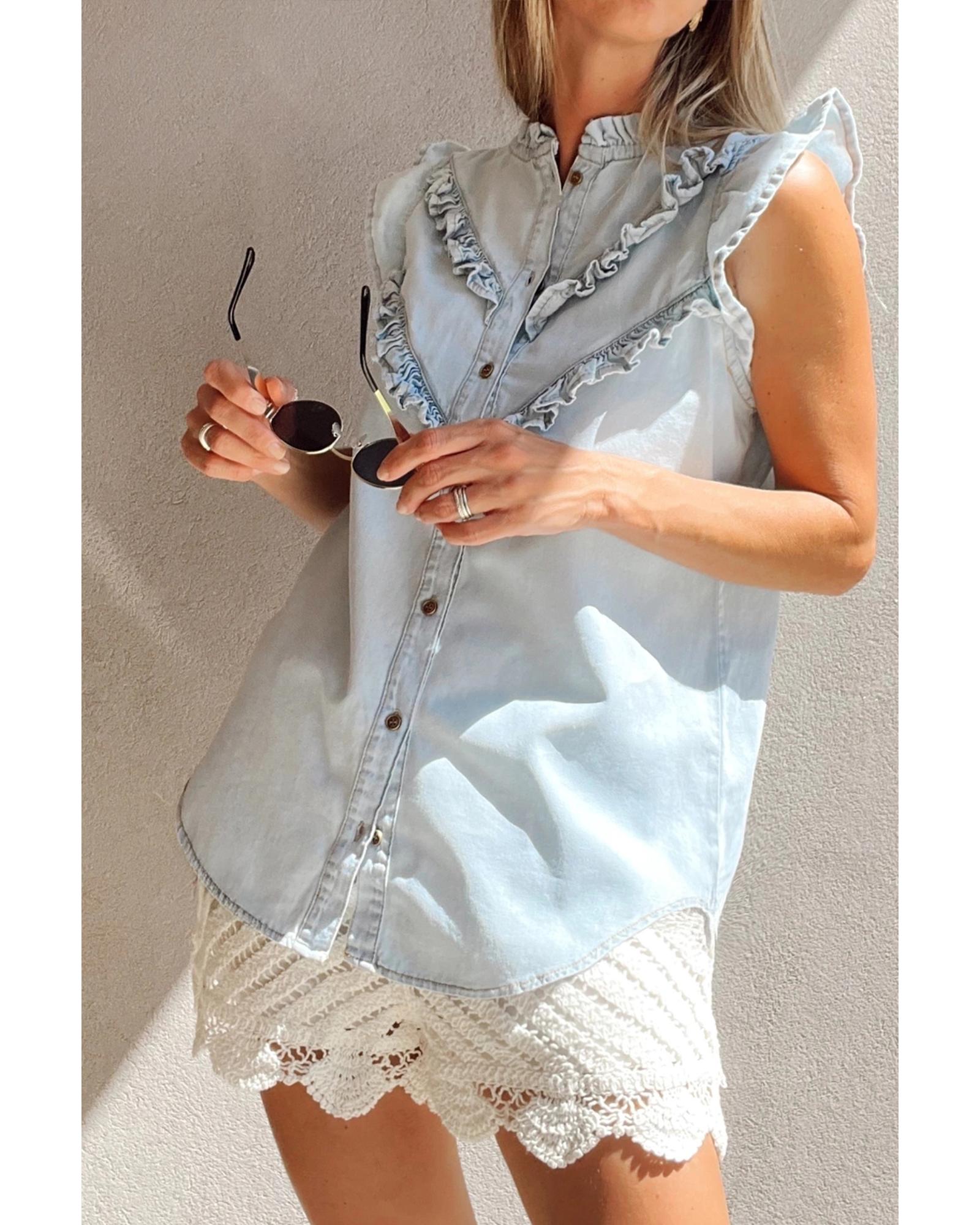 This denim shirt features a mineral wash finish and a stylish design with cap sleeves and frilled trim details. It combines a classic button-up style with a modern touch, making it suitable for various casual occasions. The shirt is available in multiple sizes to ensure a comfortable fit.