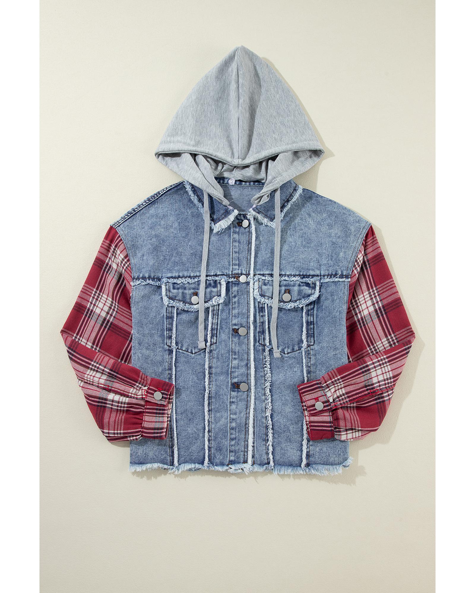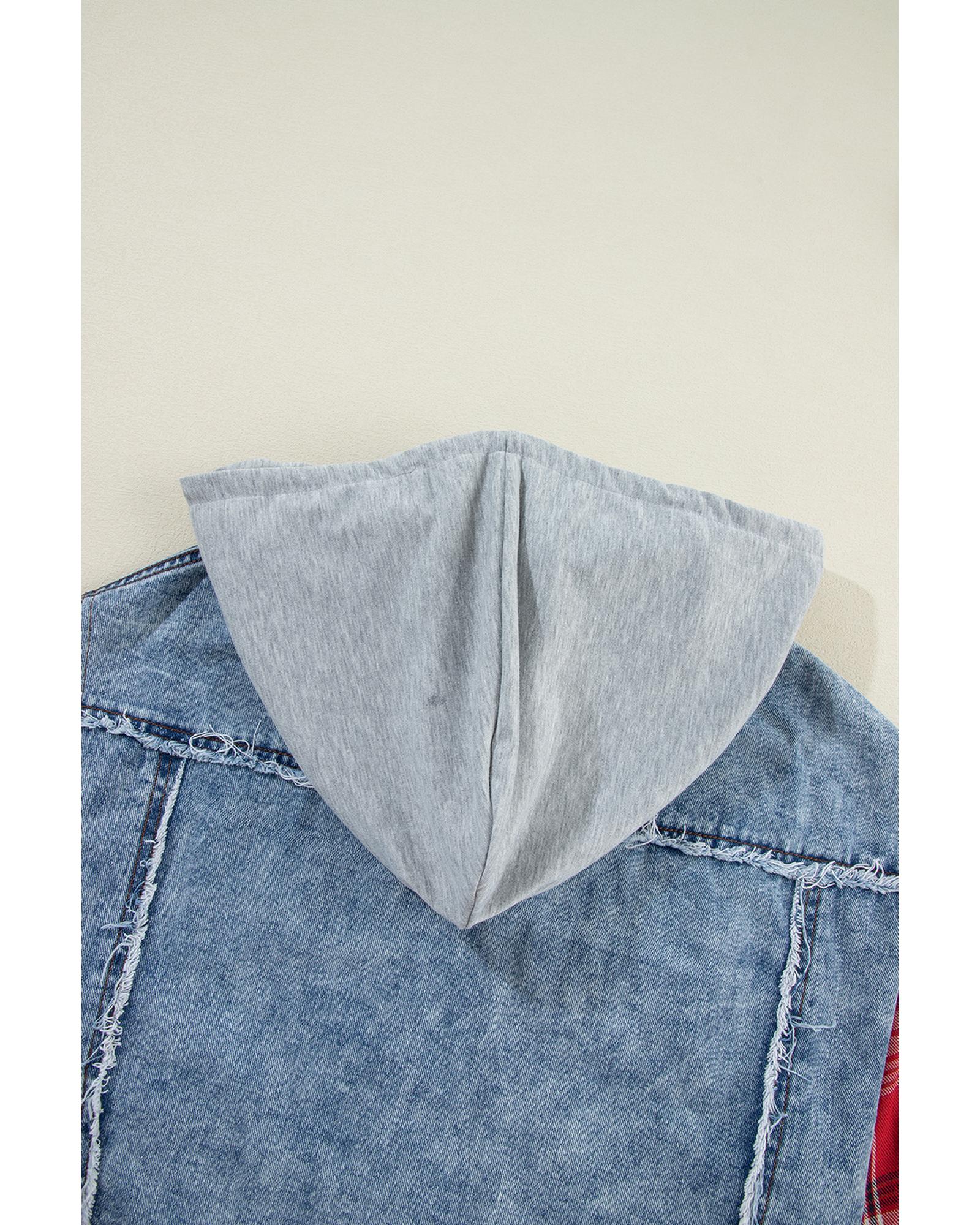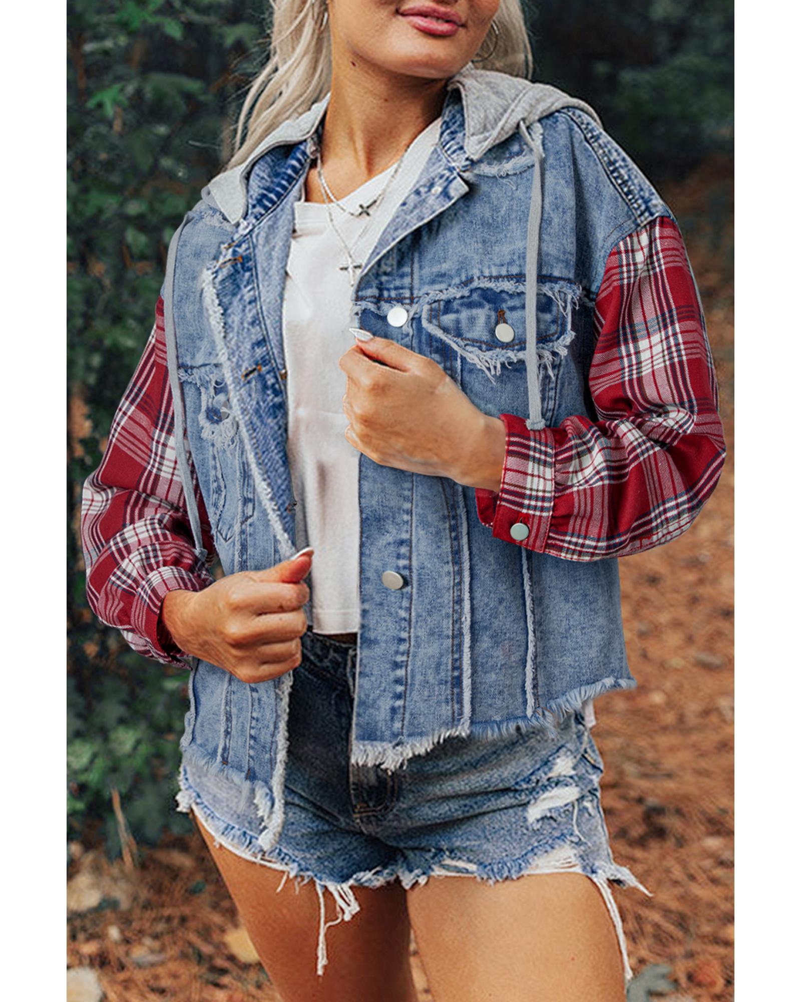 This denim jacket features a trendy fitted design with a hood and a distinctive plaid patchwork pattern. It is crafted with distressed hem details, making it a stylish choice for casual wear. The jacket is versatile and easy to pair with T-shirts and jeans for a complete casual look.