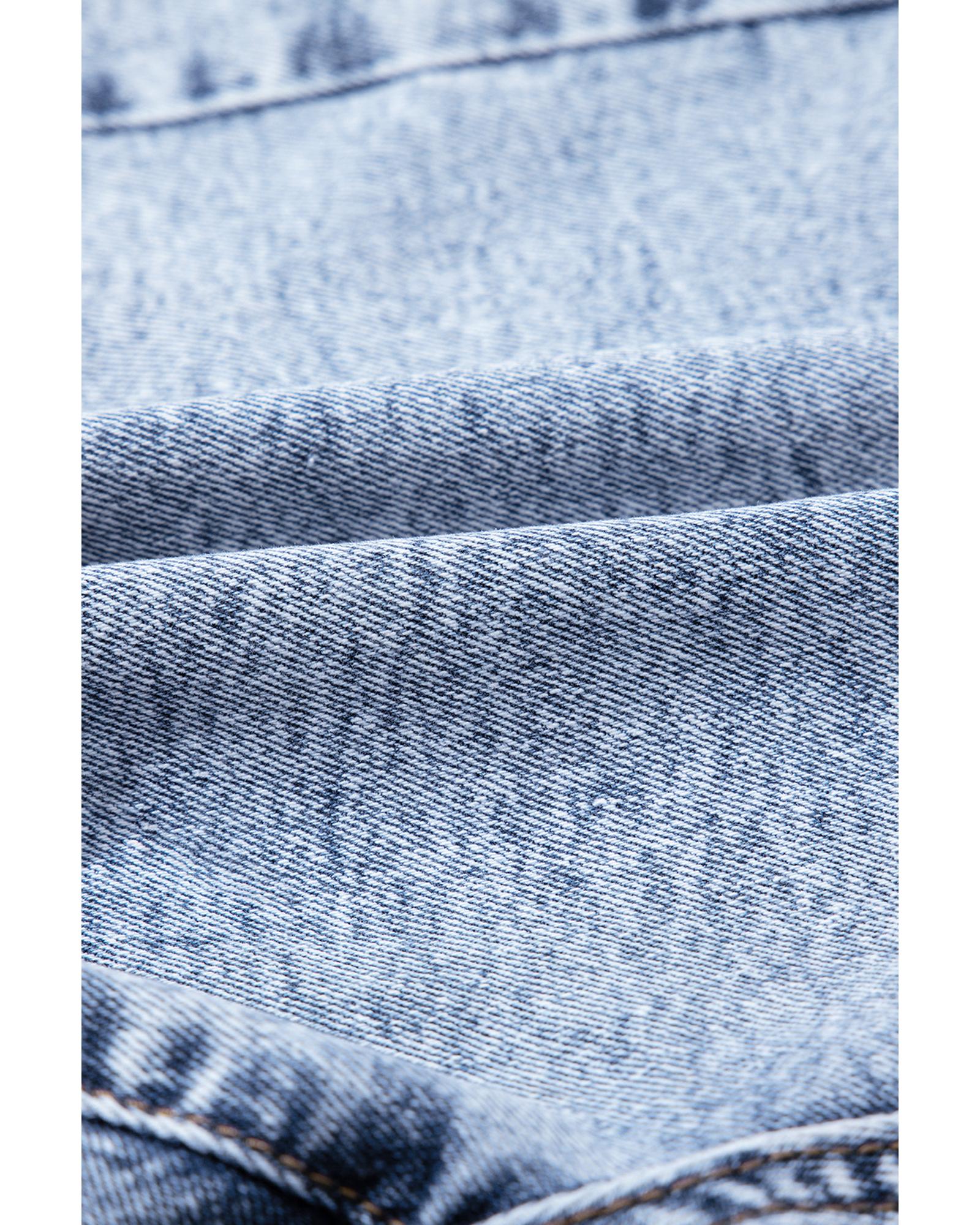 This pair of denim shorts features a high waist design that accentuates the waistline and elongates the legs, combined with rhinestone embellishments for added sparkle. The light wash denim provides a casual and laid-back vibe, complemented by a raw hem detail for a modern and edgy look. Designed with high elasticity, these shorts offer a comfortable fit suitable for various body types.