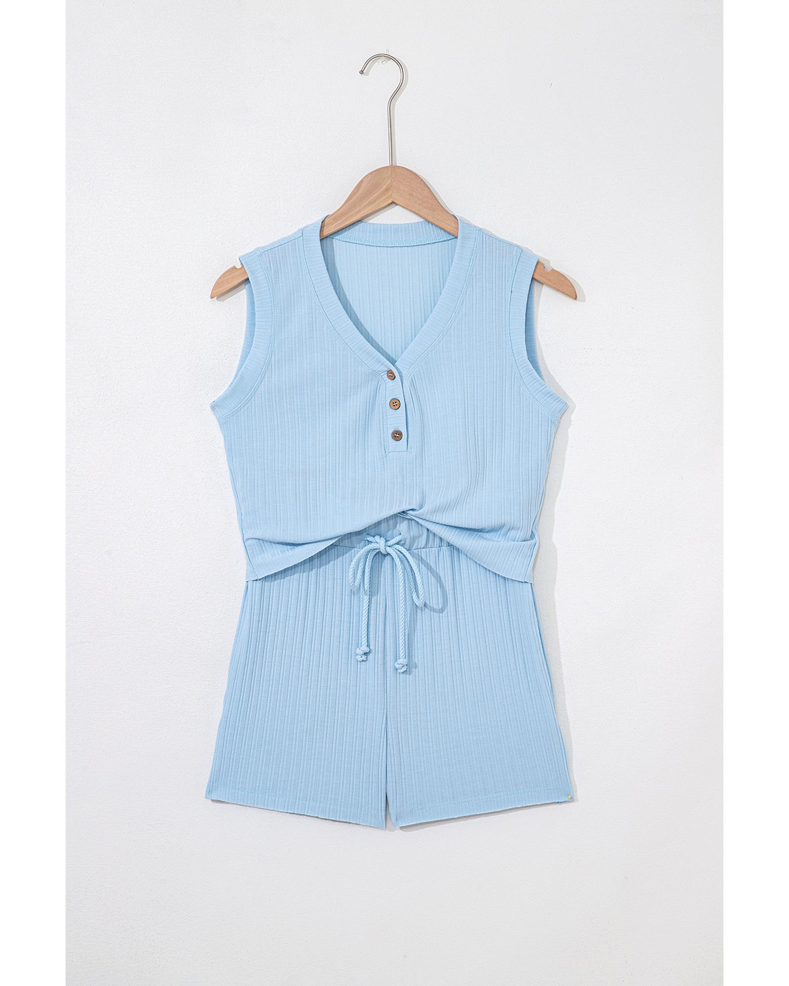 This set includes a ribbed tank top and matching shorts, designed for a stylish and comfortable look. The ribbed texture adds depth to the outfit, while the buttoned V-neck design offers a touch of elegance. The sleeveless tank top provides a breezy fit, making it suitable for warm weather. The solid color enhances a sleek and polished appearance, making it versatile for various occasions.
