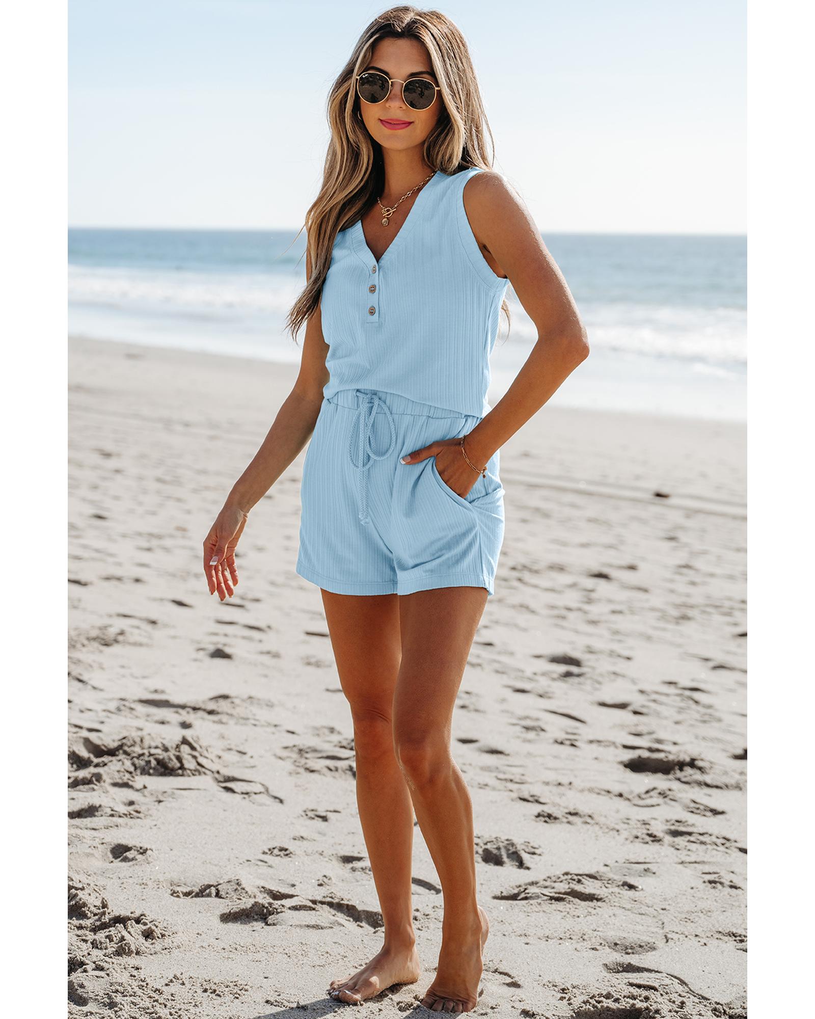 This set features a ribbed texture that adds depth to your outfit, combining a stylish tank top with matching shorts. The V-neck design with buttons offers a touch of elegance, while the sleeveless cut provides a breezy, relaxed fit. The solid color enhances a sleek and polished appearance, making it suitable for various casual occasions.