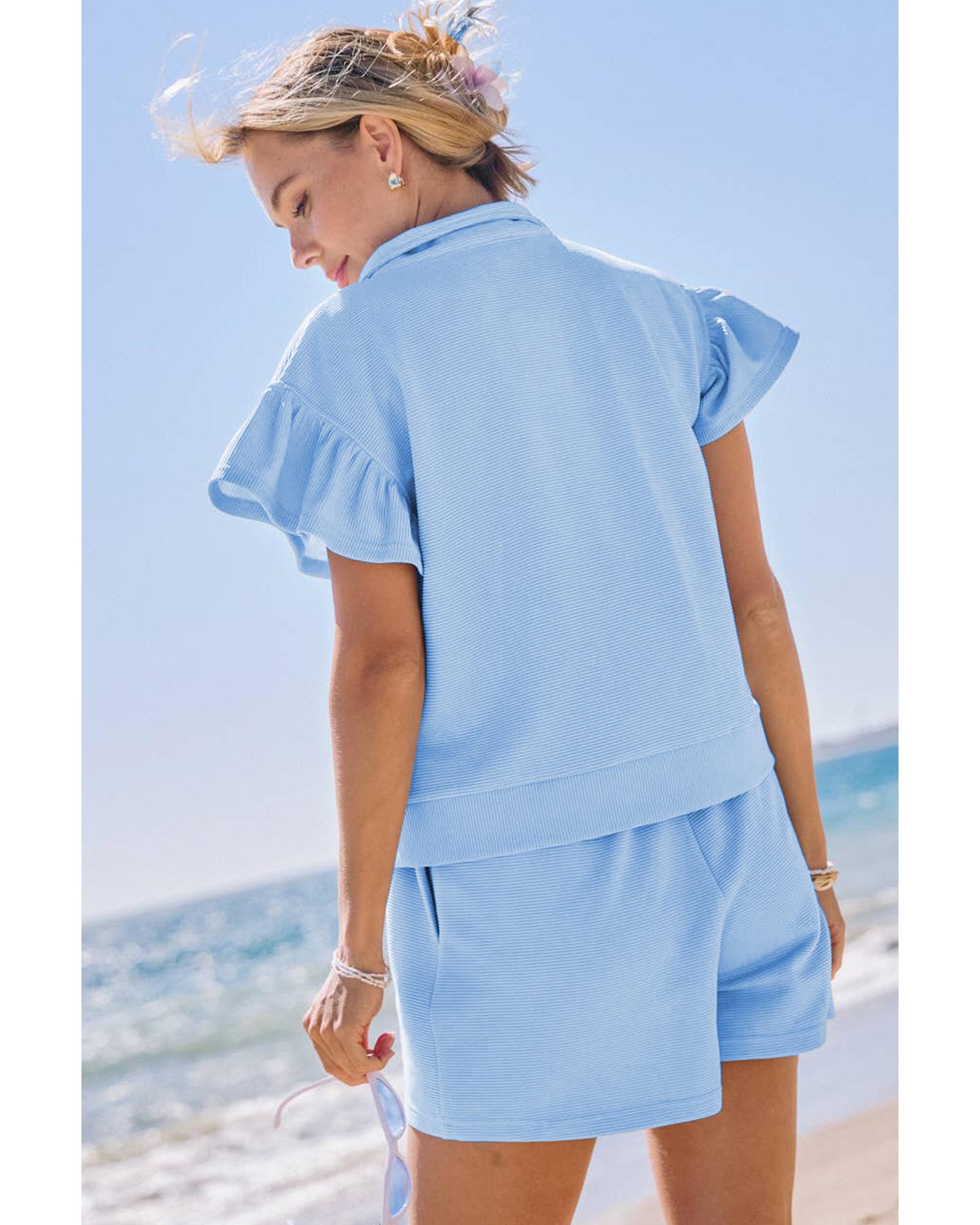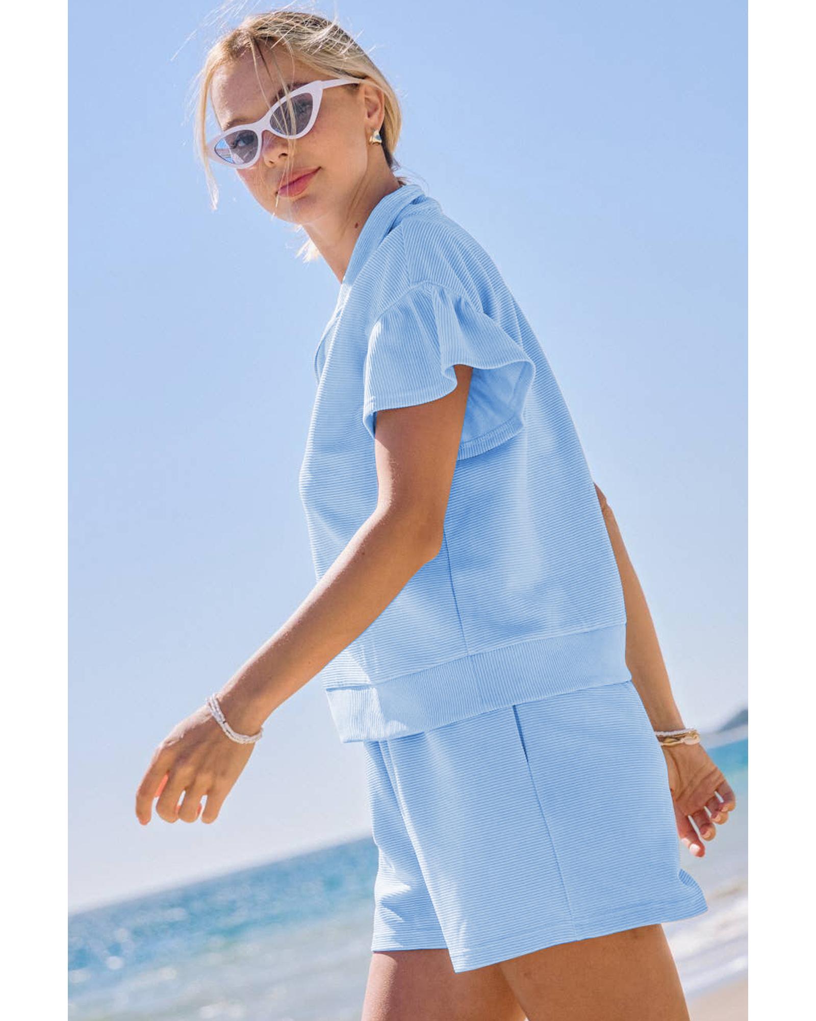 Beau Blue Ribbed Texture Half Zip Ruffled Short Sleeve Top and Shorts Set – L