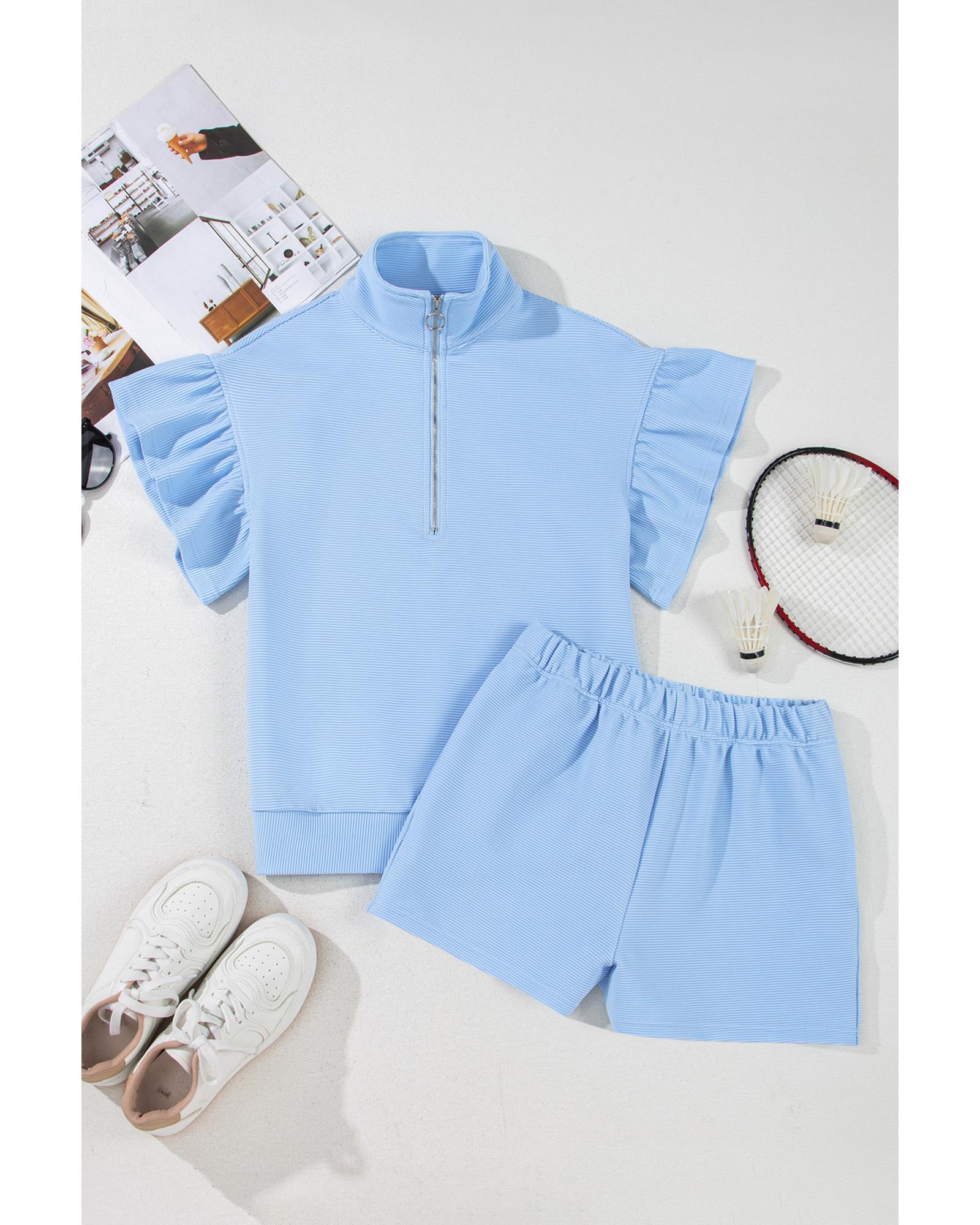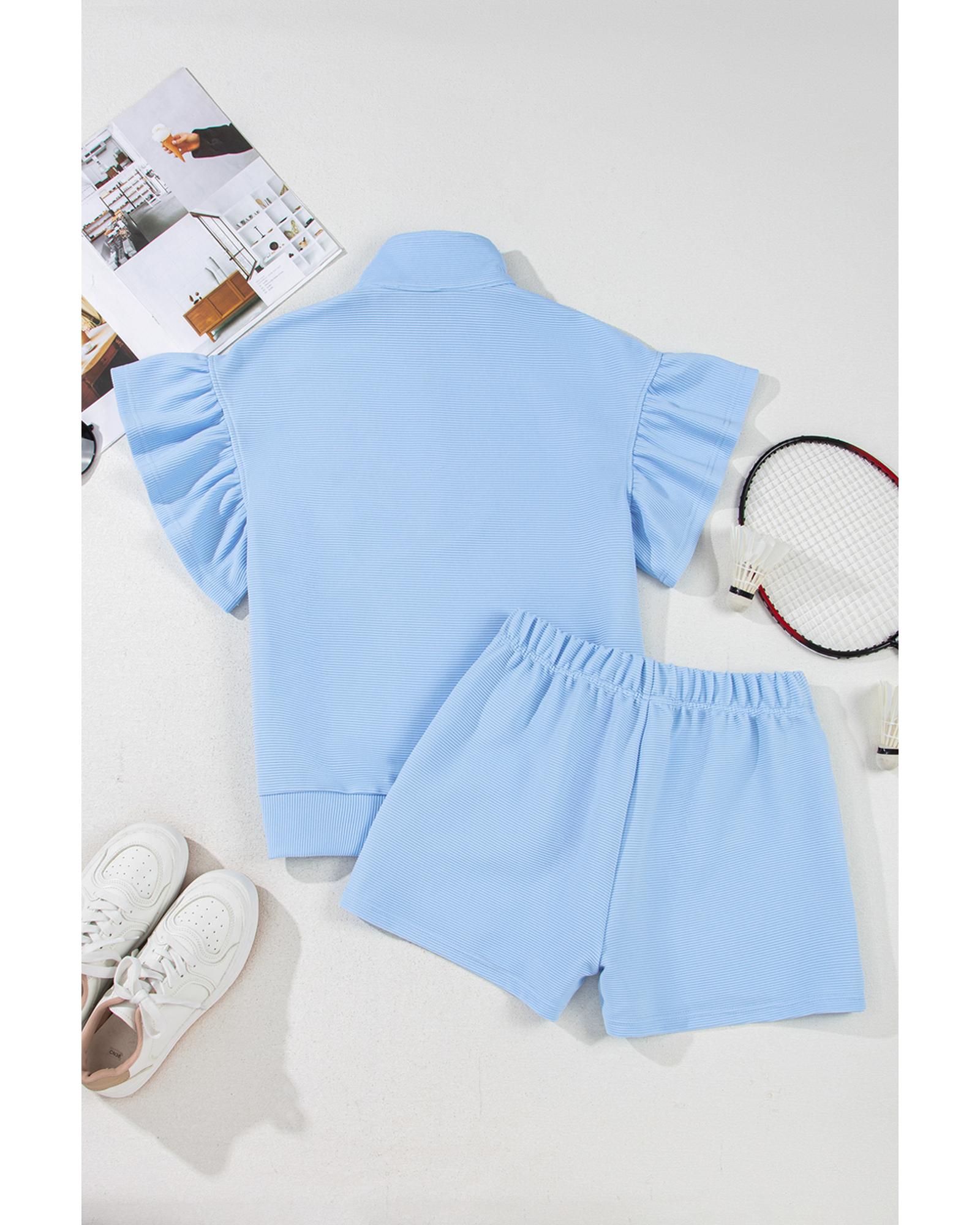 This set features a ribbed texture design with a half zip top and matching shorts, creating a stylish and coordinated look. The short sleeve top is adorned with playful ruffles, adding a touch of femininity. Ideal for casual occasions, it can be paired with sandals or sneakers for a relaxed yet chic appearance.