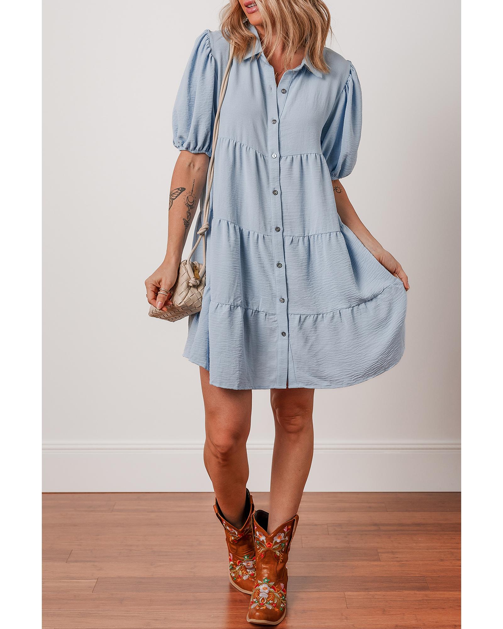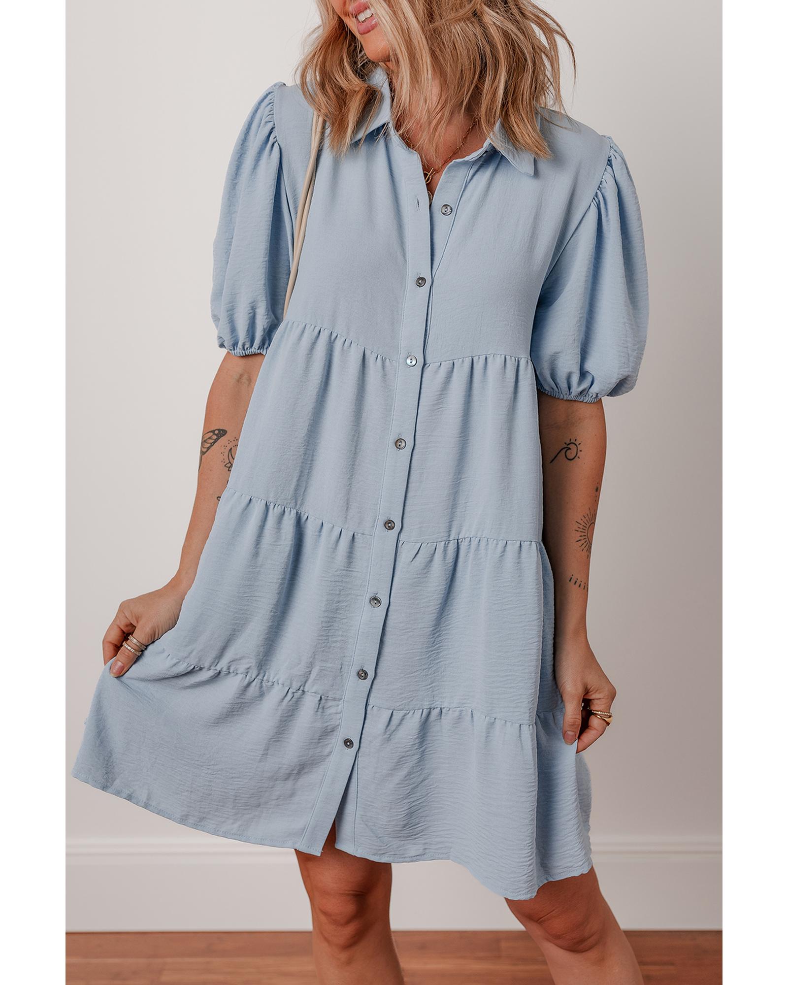 Beau Blue Shirt Collar Button Up Short Puff Sleeve Tiered Shift Dress – L