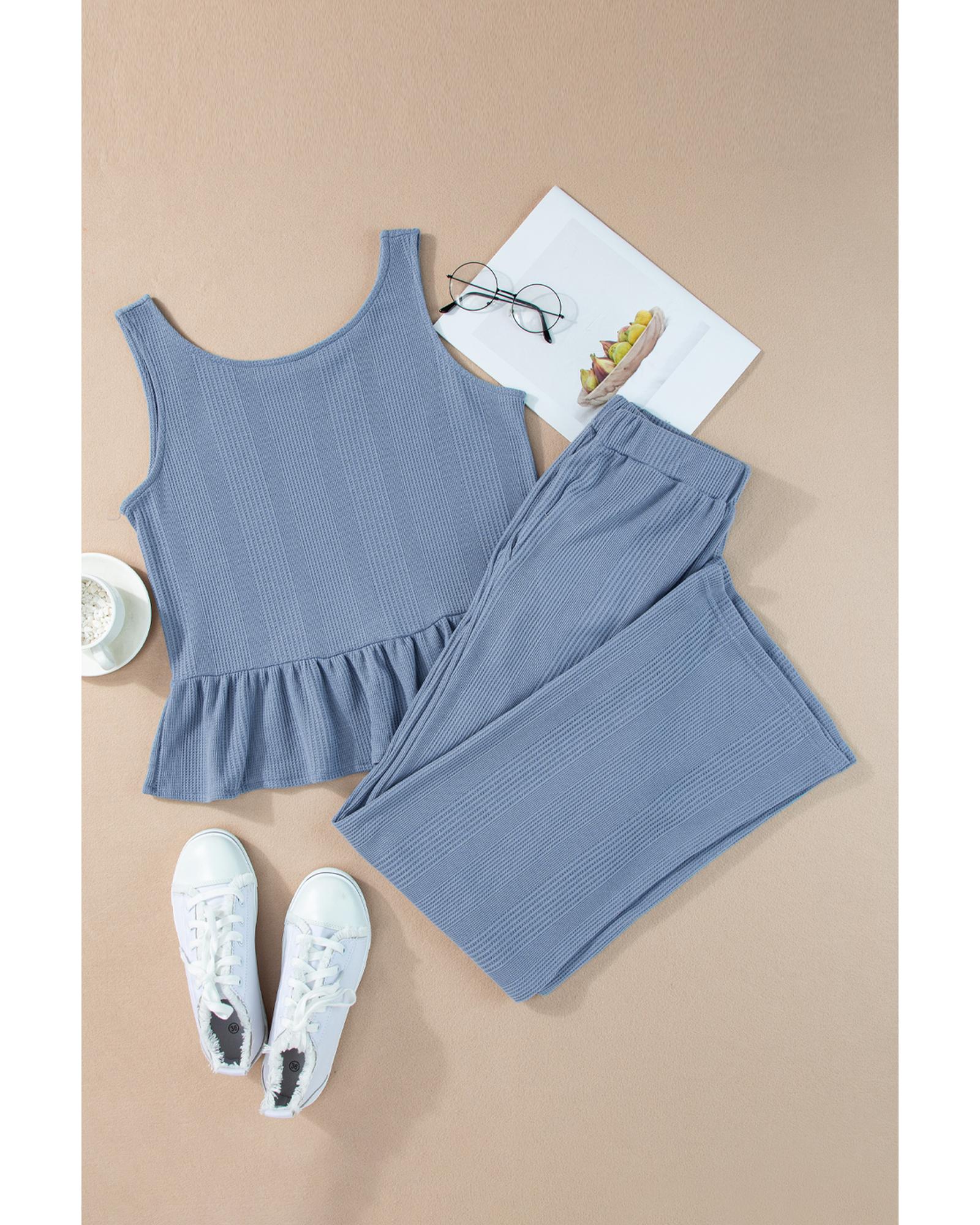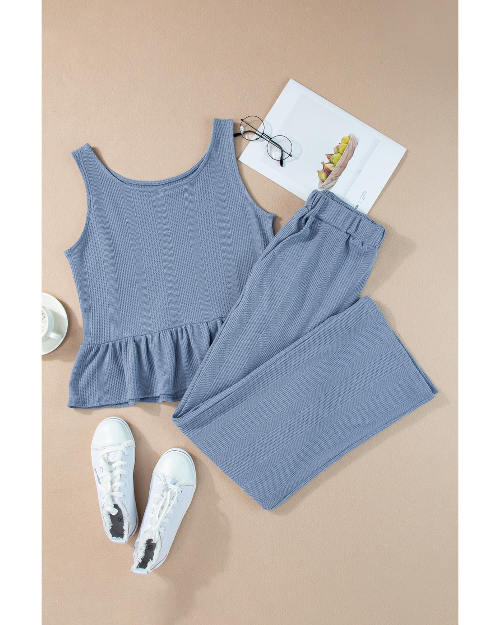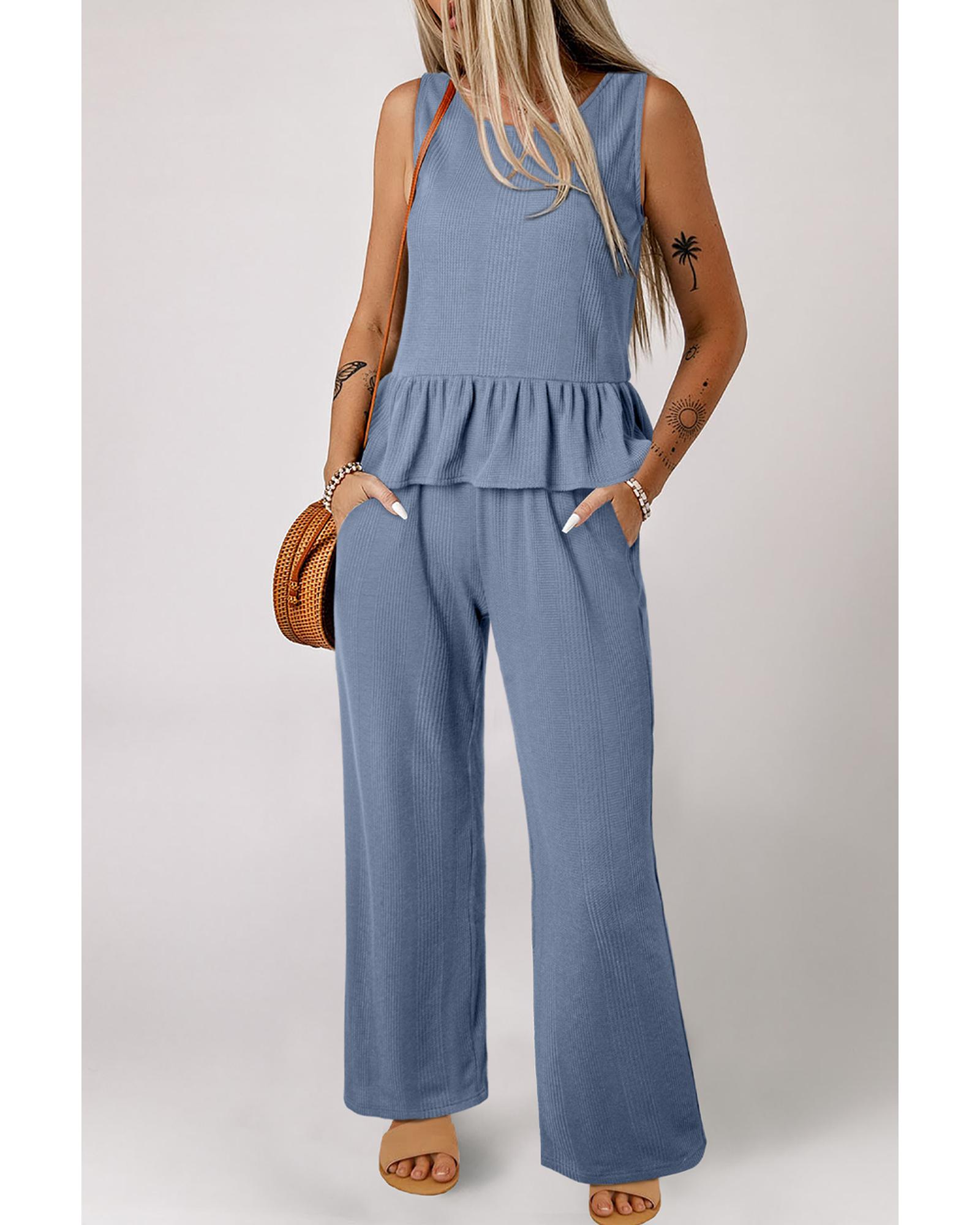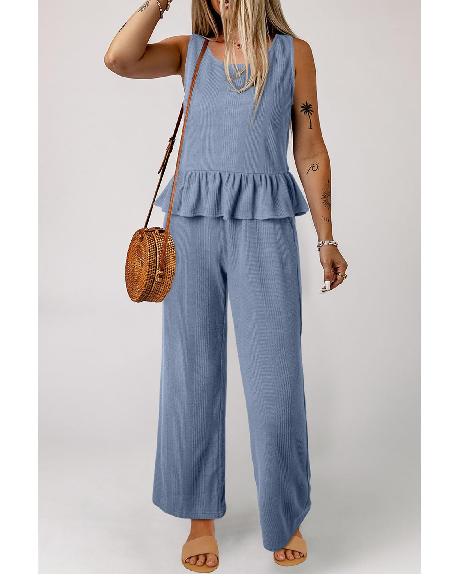Beau Blue Solid Color Ribbed Ruffle Tank Top and Pants Set – S